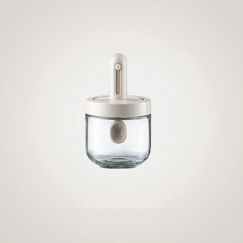 Den integrerte, uttrekkbare skjeen gjør det enkelt å øse opp krydder fra bunnen. Det gummiforseglede lokket holder innholdet friskt, og det klare glassdesignet er elegant. Perfekt til oppbevaring av krydder, krydder og til og med flytende sauser.