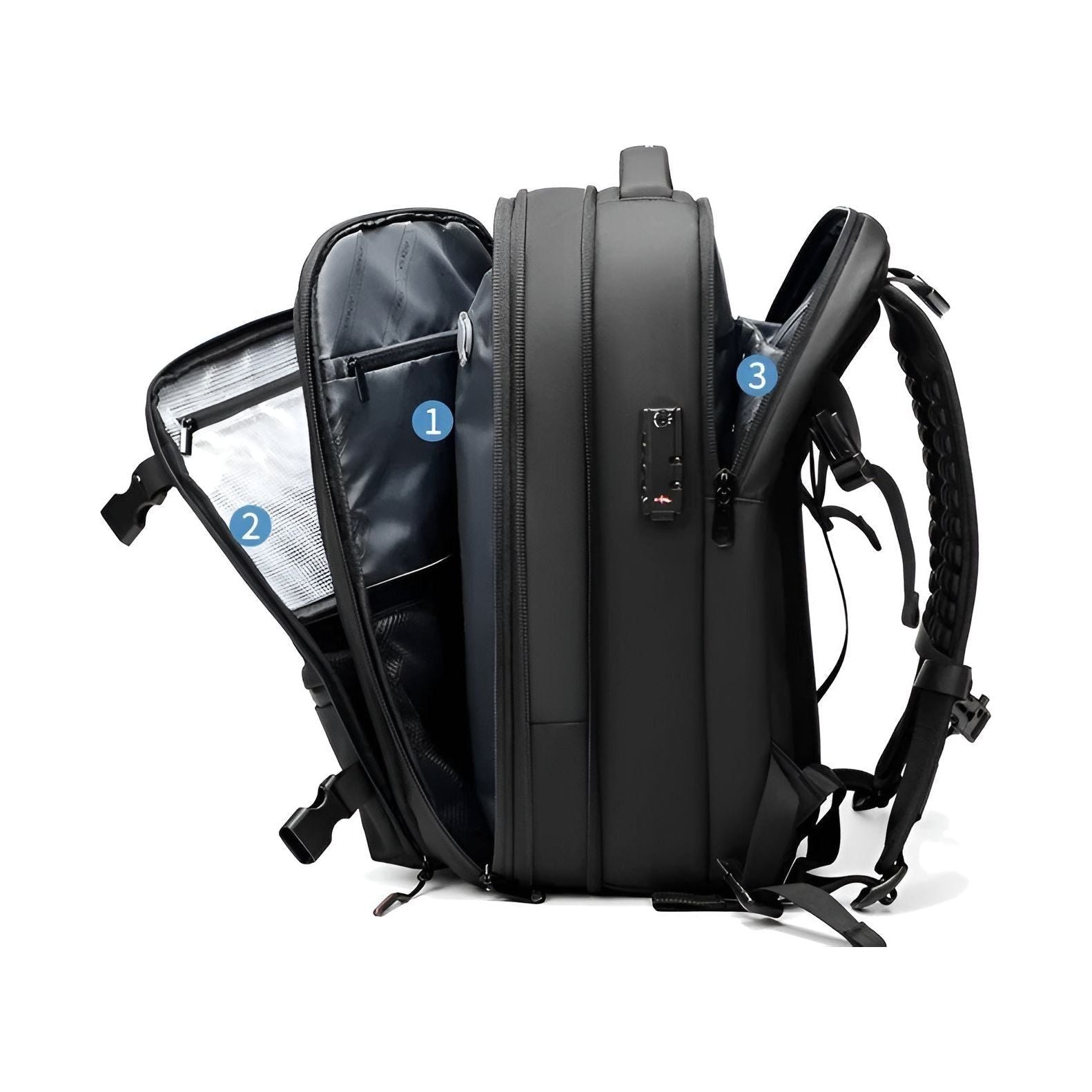 Det innebygde vakuumkompresjonssystemet lar deg komprimere klær og nødvendigheter enkelt, noe som frigjør plass for mer uten å legge til volum. Nyt en organisert, plassbesparende pakking for hver reise.