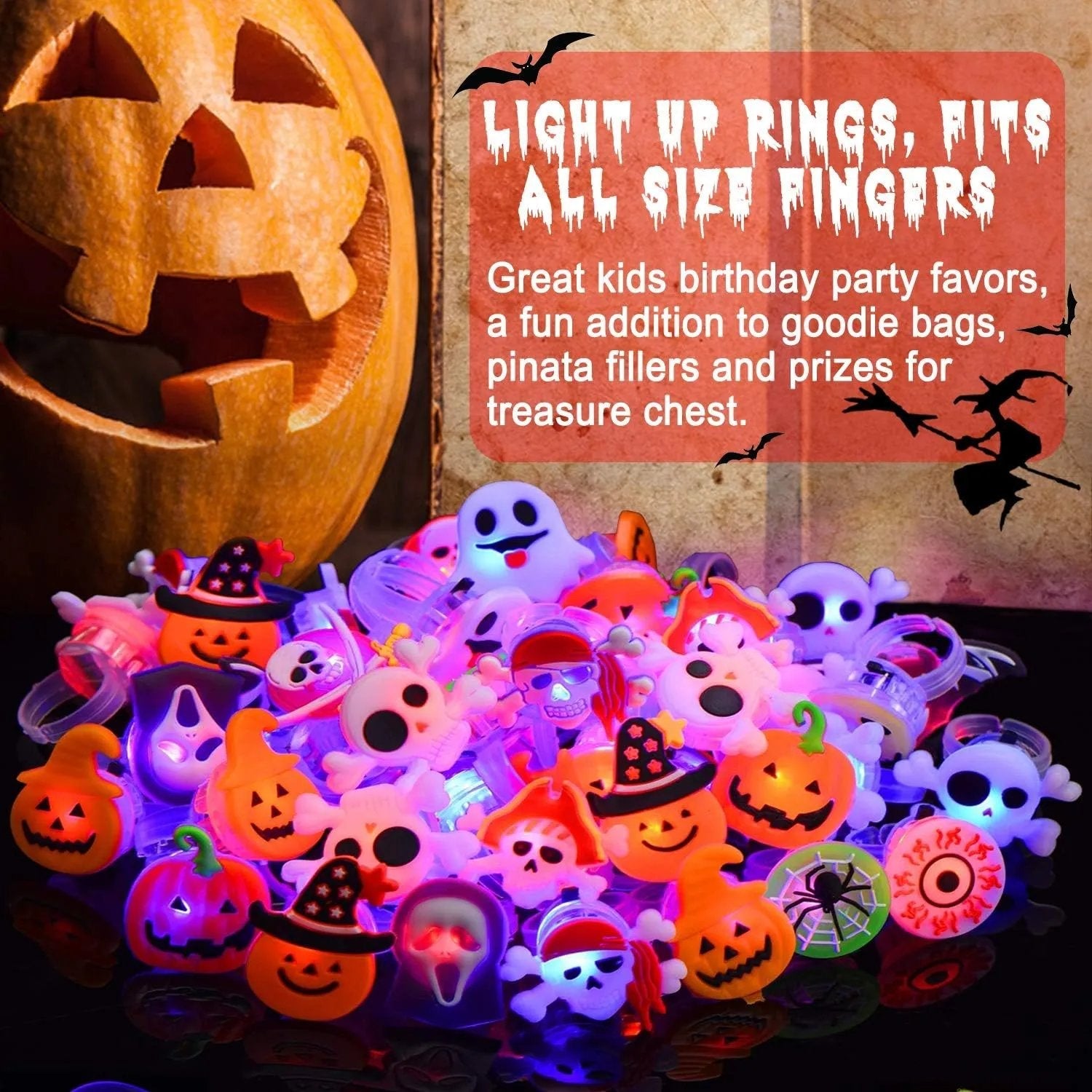 【Fantastisk Lyseopp Ring Sett】Sett med 50 lekne og søte ringformer. Sjarmerende barneringer pryder Halloween-godteriposer, gir barna en uforglemmelig Halloween-opplevelse. Halloween ringleketøy skaper en skummel stemning, barna vil ha det moro.