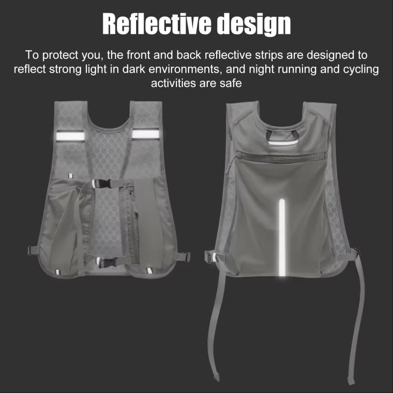 Denne løpehydratiseringsvesten er designet for langvarig bruk og tilbyr en trygg og praktisk løsning for å bære med seg vann og andre nødvendigheter under langdistanseløp, sykling eller utendørs aktiviteter. De refleksive stripene både foran og bak øker synligheten, noe som gjør nattsykling og løping tryggere.
