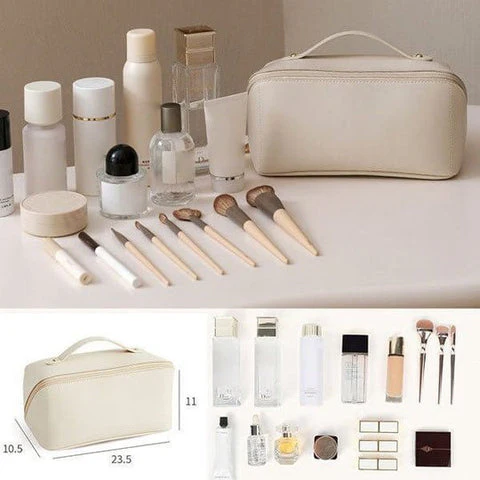 Vår luksuriøse kosmetikkveske er det ideelle valget for stilbevisste kvinner som verdsetter både stil og funksjon. Denne vesken i høy kvalitet til kvinner skiller seg ut med sitt sofistikerte design og gir rikelig med plass til å organisere både sminke og hudpleieprodukter.
