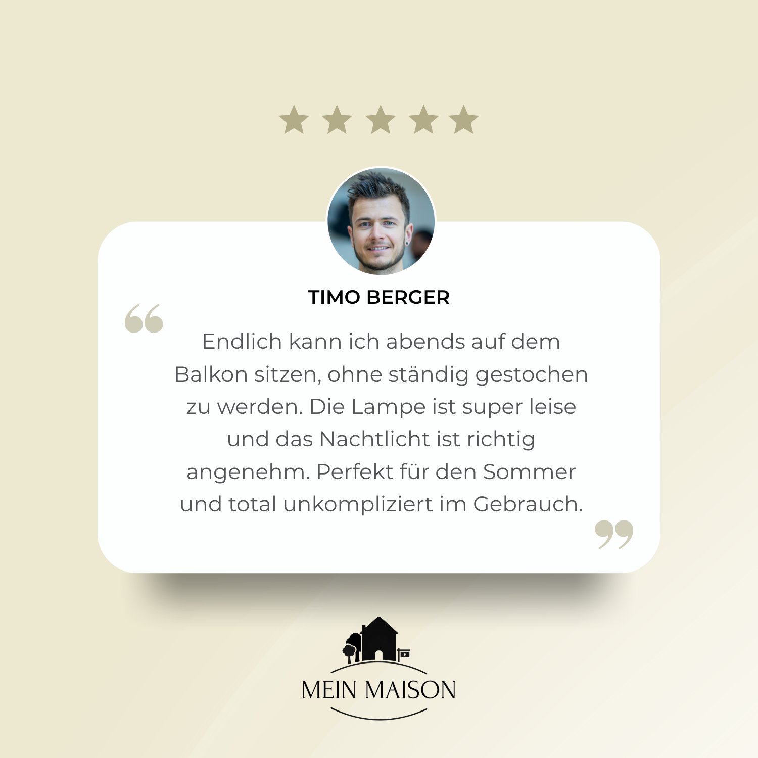 Opplev roen – uten myggbitt – Den Lunavax mygglampen forener stilfull design med effektiv teknologi for bekjempelse av skadedyr – helt stille, uten giftstoffer, og perfekt for familier med barn og kjæledyr. Ideell for soverom, terrasser eller på campingtur.