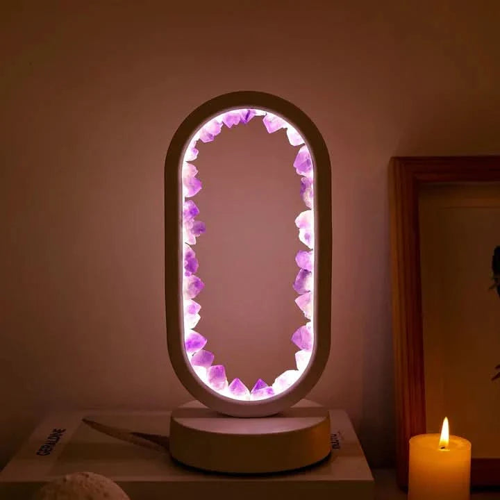 En særegen lampe laget av naturlig ametyst, anerkjent for sine beroligende og helsefremmende egenskaper. Denne lampen tilfører ikke bare rommet ditt et mykt og varmt lys, men hever også stemningen med sin naturlige skjønnhet. Ametyst antas å fremme avslapning og redusere stress, noe som gjør den perfekt for soverom, stuer eller meditasjonsområder.