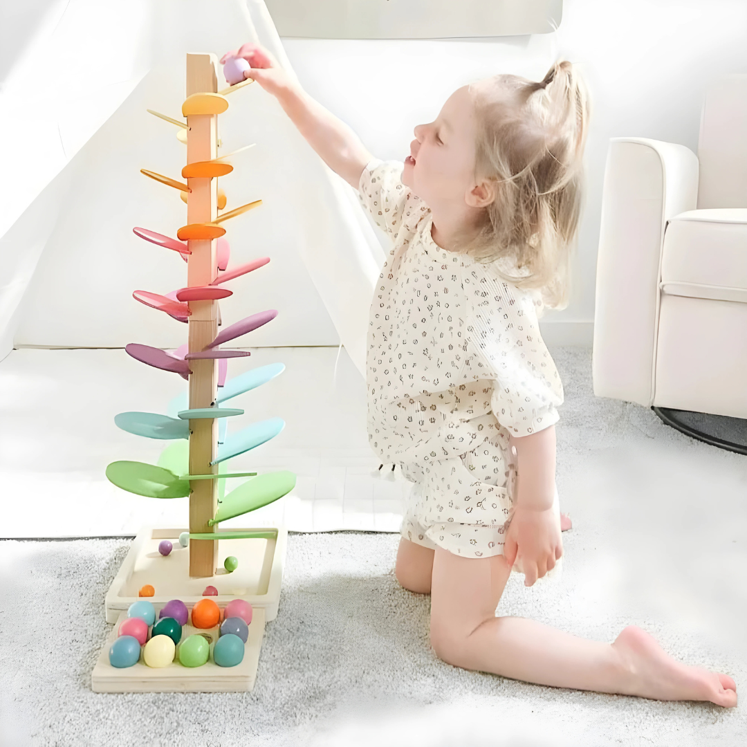 Forvandle læring til moro med en livlig marmeløype laget av bærekraftig treverk. Denne treleken gir barna muligheten til å utforske marmorer som ruller nedover rampene, noe som fremmer både konsentrasjon og motoriske ferdigheter. De klare regnbue fargene og de myke lydene bidrar til en avslappende sanseleke opplevelse, inspirert av Montessori pedagogikk.