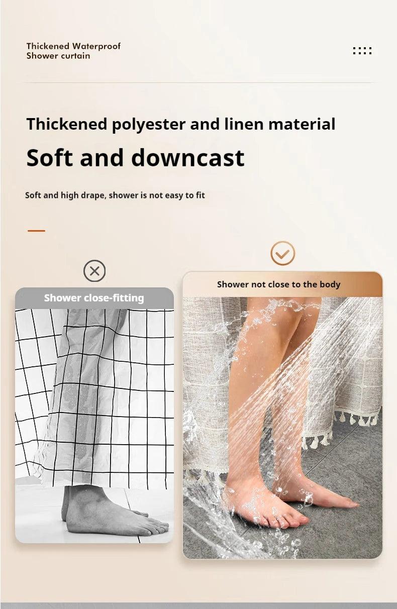 Robust og Vannavstøtende: Dette dusjforhenget er laget av førsteklasses lin, som sikrer at det er både robust og vannavstøtende. Det tåler daglig bruk samtidig som det gir utmerket fuktbeskyttelse.