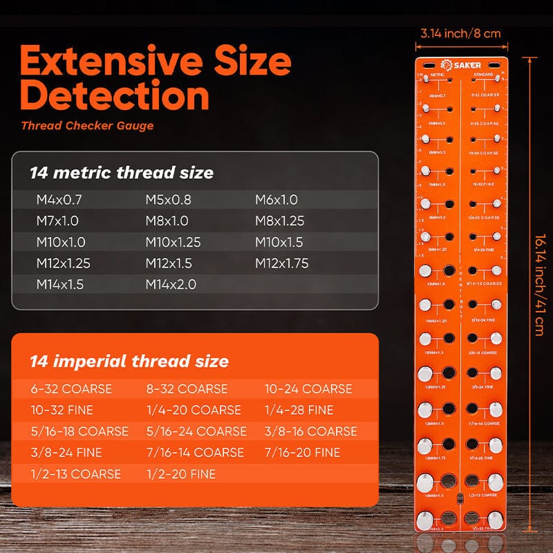 - NØYAKTIGHET I STØRRELSE - Saker Muttern og Bolt Gjengemåler lar deg raskt finne 28 varierte størrelser, inkludert metriske gjenger fra M4 x 0,7 til M14 x 2,0 samt imperiale gjenger fra #6 - 32 grov til 1/2 - 20 fin.