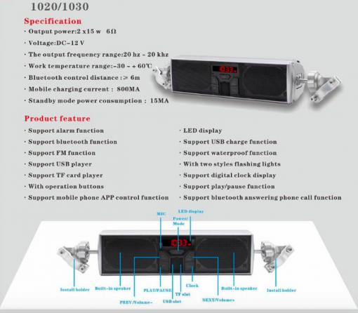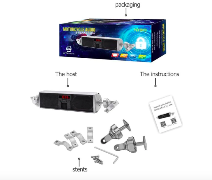 Våre vanntette høyttalere for motorsykler oppfyller strenge krav til utendørs bruk - de er både vanntette og støvbeskyttende - noe som er essensielt for en høyttaler på motorsykkel. Den har en minnefunksjon som husker strømmen av, LED-belysning på baksiden, en tyverisikringsfunksjon, støtte for USB-avspilling, TF-kortavspilling, MP3-format og radio, samt mulighet for kontroll via mobil APP-programvare og mer!
