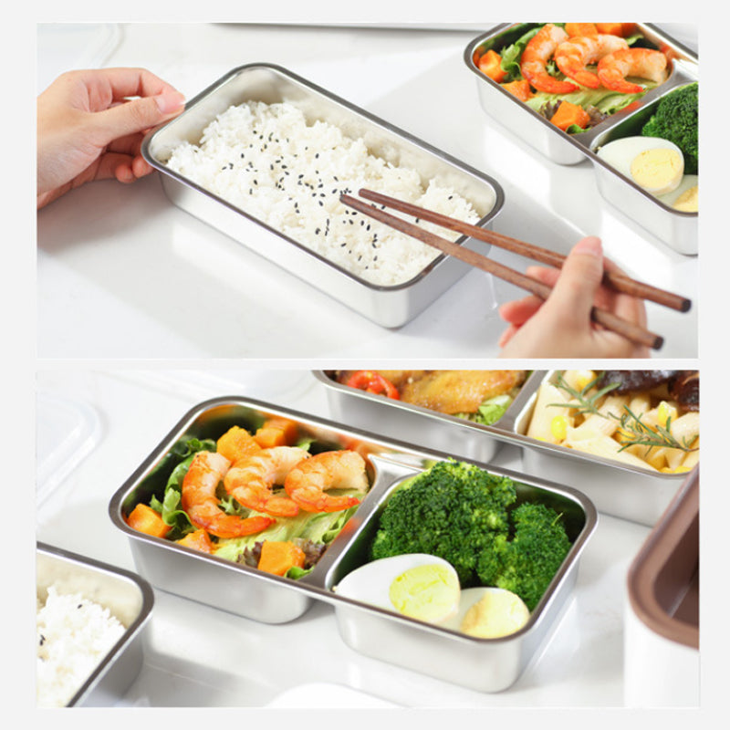 Bærbart design: De rustfrie stålskålene og tallerkenen kan enkelt tas av for lettvint rengjøring. Lokket som følger med skålene bidrar til å forhindre søl og holder maten din trygg og ryddig under transport. Husk å fjerne lokket når du lager mat eller varmer opp.