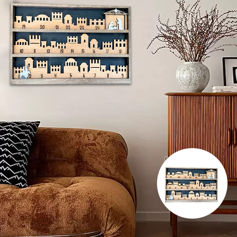 - Skiltet er laget av flere lag med tre og har en rille langs tallene som karakterene beveger seg gjennom. På julaften bytt ut telle-delen med krybbedelen med baby Jesus.