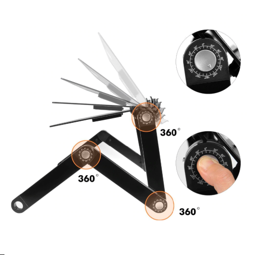 - Justerbare Ben: Benene kan rotere 360 grader og justeres til forskjellige vinkler. Med 6 robuste, justerbare ledd som låses selv, sikrer det datamaskinen din og gir deg mulighet til å bruke den i en komfortabel posisjon, noe som er bra for helsen din ved å redusere nakkesmerter og skuldersmerter som oppstår av dårlig holdning.