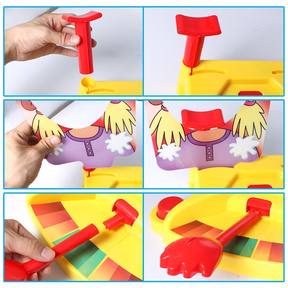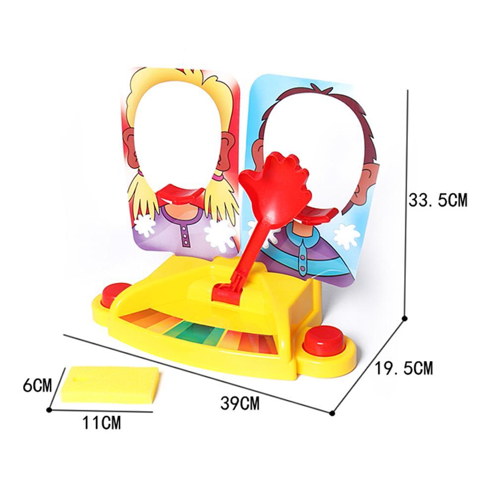 Pie Face-spillet har blitt en spennende direkte konkurranse! Deltakerne fyller armen med pisket krem (pisket krem er ikke inkludert) eller den medfølgende svampen, og fester deretter haken på en av hakenes støtter. Når de teller til tre, trykker spillerne på den store røde knappen nærmest for å prøve å aktivere mekanismen som vil kaste paien mot motstanderen. Når armen nærmer seg for mye, vil den sprette opp, og noen vil få et ansikt fullt av pisket krem! Den andre spilleren vinner. (Pisket krem ikke inkludert).