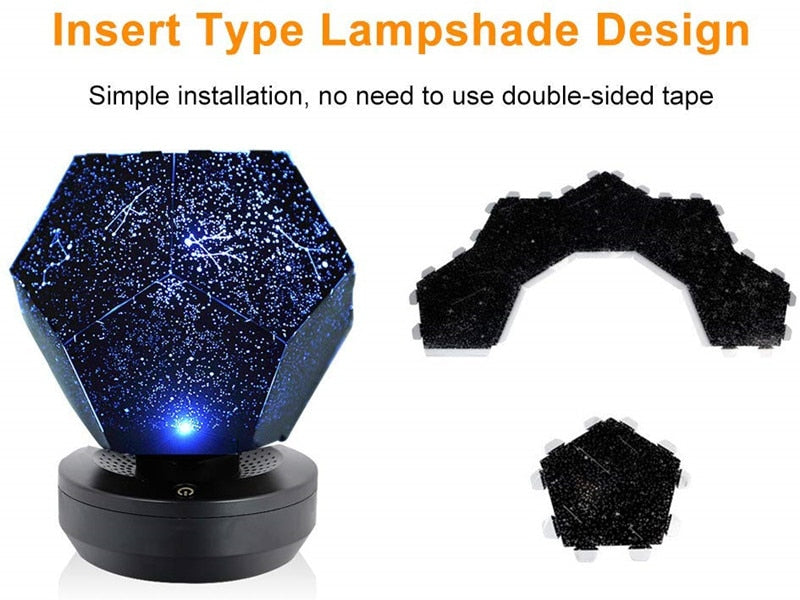 STJERNEPROSJEKTOR & DIY LAMPESKJERM MONTERING: De mange kombinasjonene av 3 grunnleggende farger (Gul, Hvit og Blå). DIY Monteringslamper i 15 minutter. Sammenleggbare plastlamper forbedrer lysprojeksjonen og leveringssikkerheten. Roterende lysfot lar deg projisere lyset rett opp eller peke i en annen retning, og prosjektet dekker ca. 130 FT2 innen en avstand på 9 FT til wall. Den stjernespekkede projeksjonseffekten forbedres ved å justere avstanden til veggen.