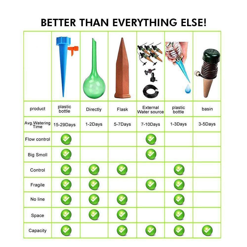 • Justérbar drypp. Hvor lenge skal du være bortreist? Juster dryppet slik at det varer fra 1 til 15 dager, så plantene dine alltid har nok vann.