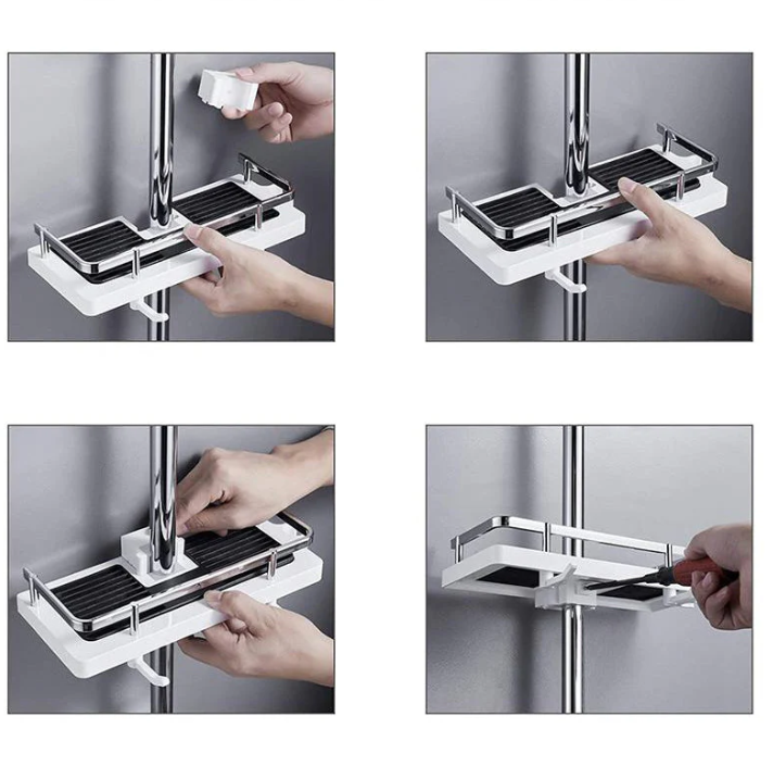 Bygget med høykvalitets, vanntette materialer, tåler hyllen enkelt fuktighet og daglig bruk. Installeringen er rask og krever ikke boring, noe som gjør den ideell for leiligheter eller raske oppgraderinger. Den kan lett monteres på dusjstangen eller veggen, tilpasset dine behov.