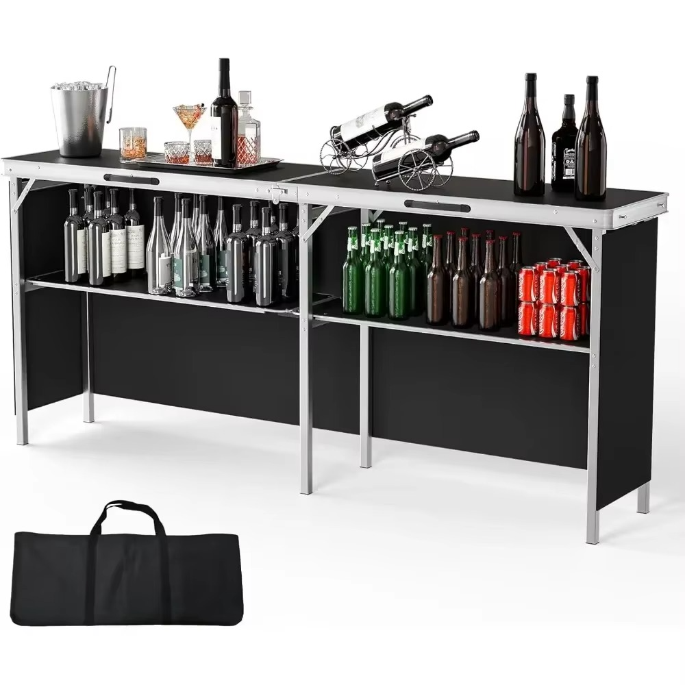 Tre romslige hyller gir rikelig med plass til flasker, glass og bartending-utstyr. Den svarte skjørtet skjuler innholdet, noe som gir et ryddig og profesjonelt utseende. Lett og sammenleggbar, kan den enkelt fraktes til hvilket som helst sted eller campingområde.