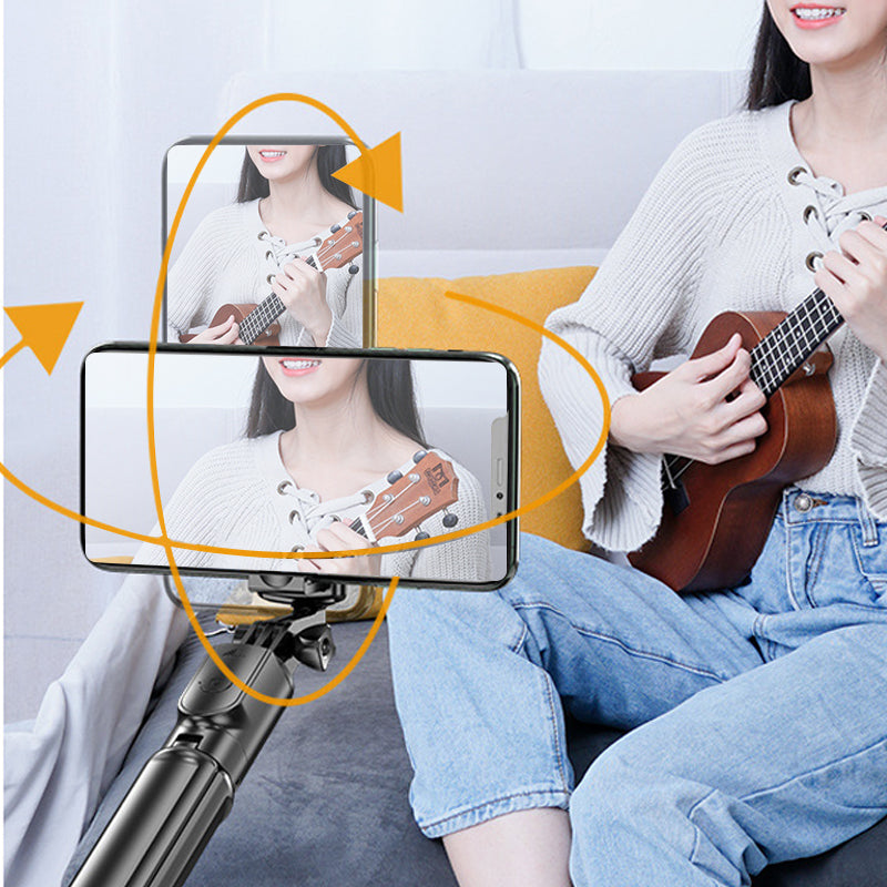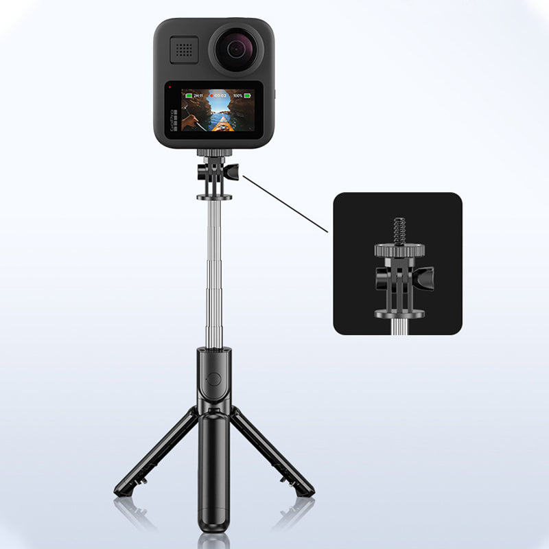 Skjult støtte: Stativbeina kan justeres og forlenges for å gi maksimal stabilitet. Når de ikke brukes, kan beina foldes inn i selfie-stangen for enklere transport.
