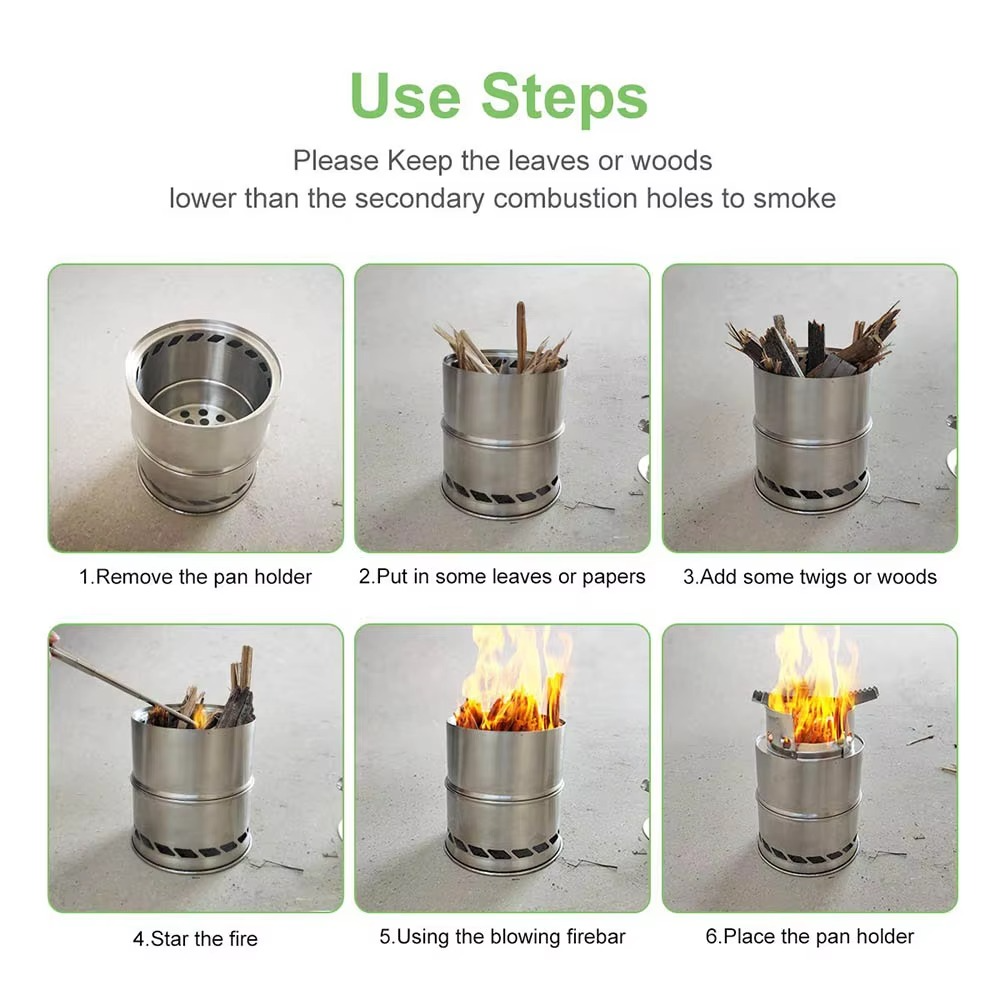laget av rustfritt stål som er korrosjonsbestandig, gir denne ovnen en robust støtte for gryter og panner. Dens effektive design utnytter varmen optimalt ved å brenne kvister, blader eller ved — ingen gass behøves.