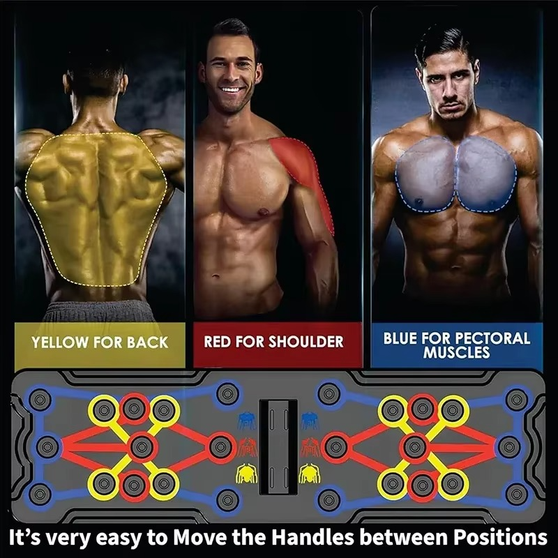Designet for å rette fokus mot sentrale muskelgrupper—som bryst, rygg, skuldre, triceps og kjerne—med fargekodede referanser for korrekt håndplassering. Få en jevn styrketrening uten forvirring.