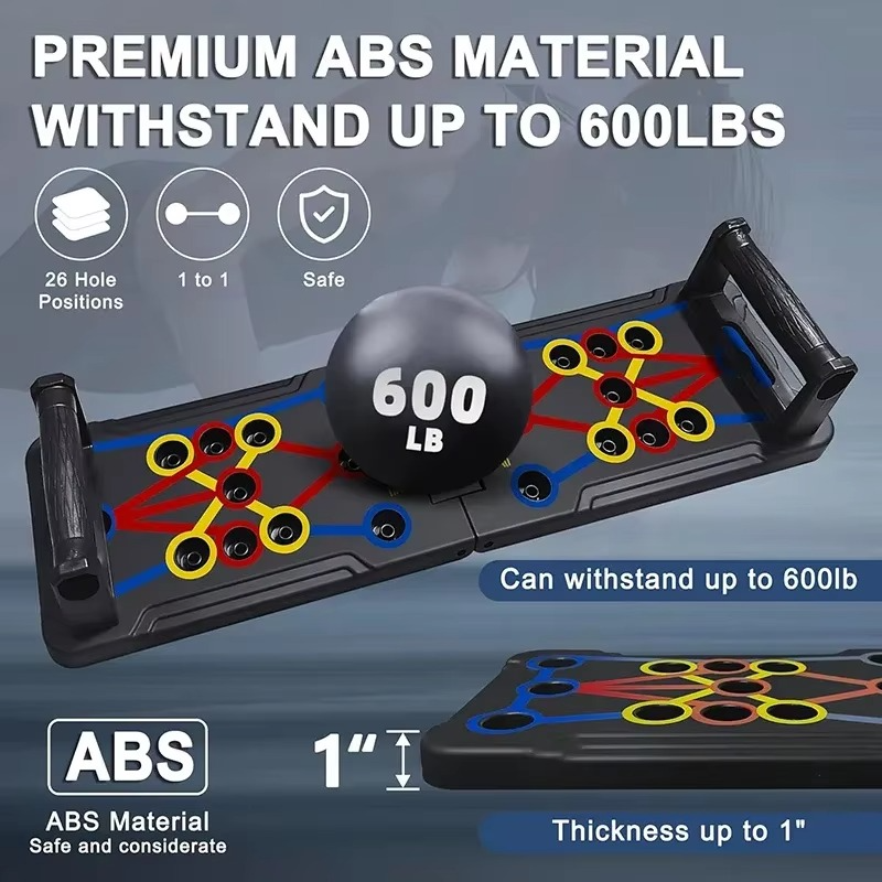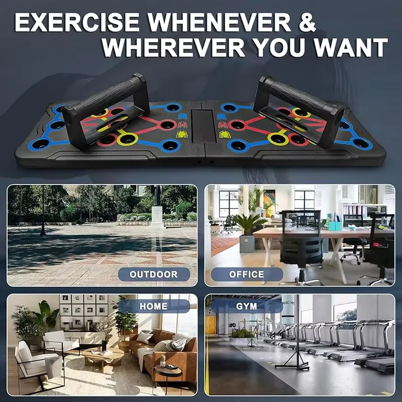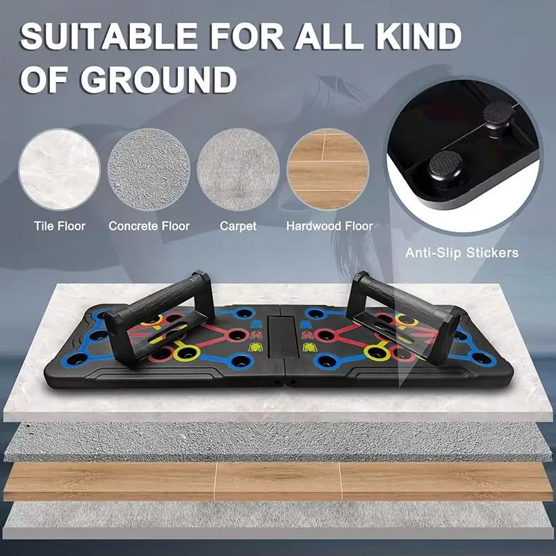 Denne multifunksjonelle brettet kan enkelt foldes for komfortabel lagring og transport. Det sklifrie grepet og de ergonomiske push-up-håndtakene gir både trygghet og behag. Solid nok for daglig bruk, effektivt for alle ferdighetsnivåer.