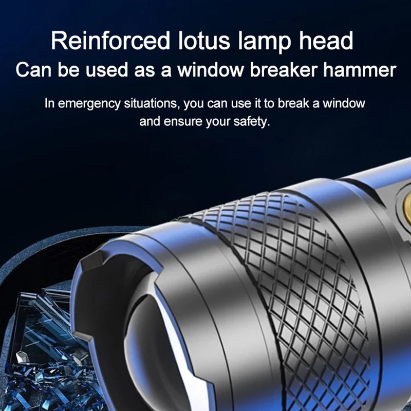 - Det forbedrede lotuslampehodet fungerer som et hammer for vindusbrytere - ett klikk kan knuse vinduet i en nødsituasjon, for å beskytte deg selv mot fare.