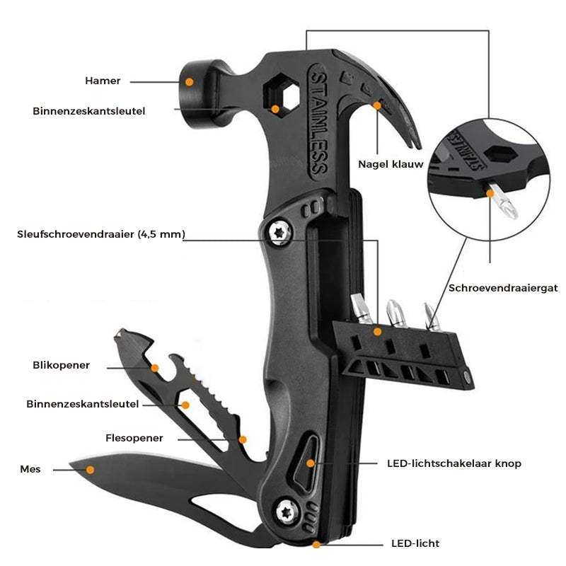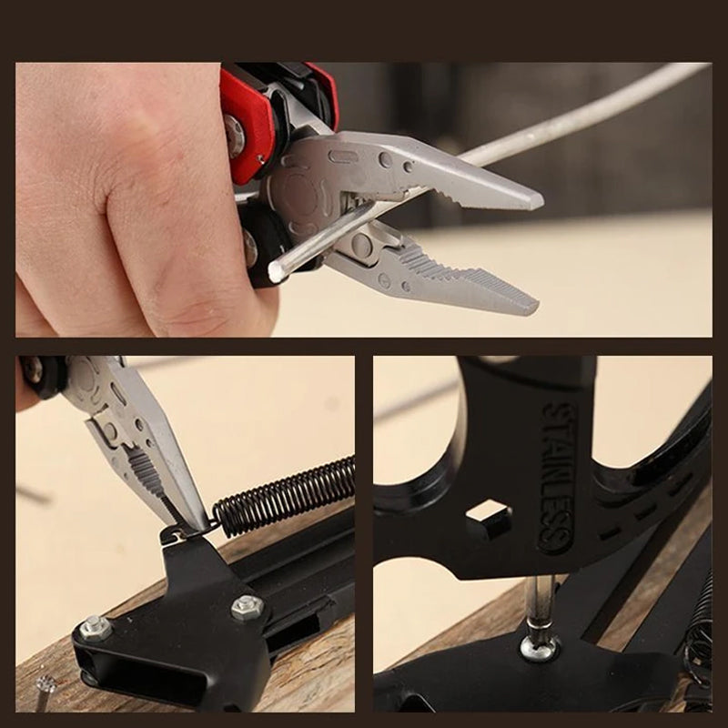 Dette tangsettet tilbyr 7 nyttige funksjoner som kan løse nesten alle oppgaver. Her finner du en minihammer, en klemmetang, en elektrisk tang, en flaskeåpner, en kniv, et skrutrekkerfeste og en spikerhever.