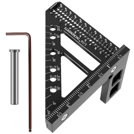 Utstyrt med innebygde linjeguider på 45° og 90°, trekantskjær for presis kvadratisk justering, samt hullmaler for jevne avstander. Den solide konstruksjonen gir 3D-referanser fra alle vinkler.