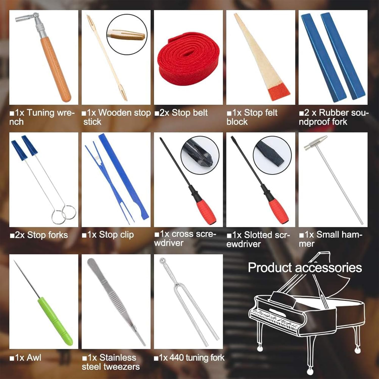 - Komplett sett med 16 essensielle piano tuning-verktøy.