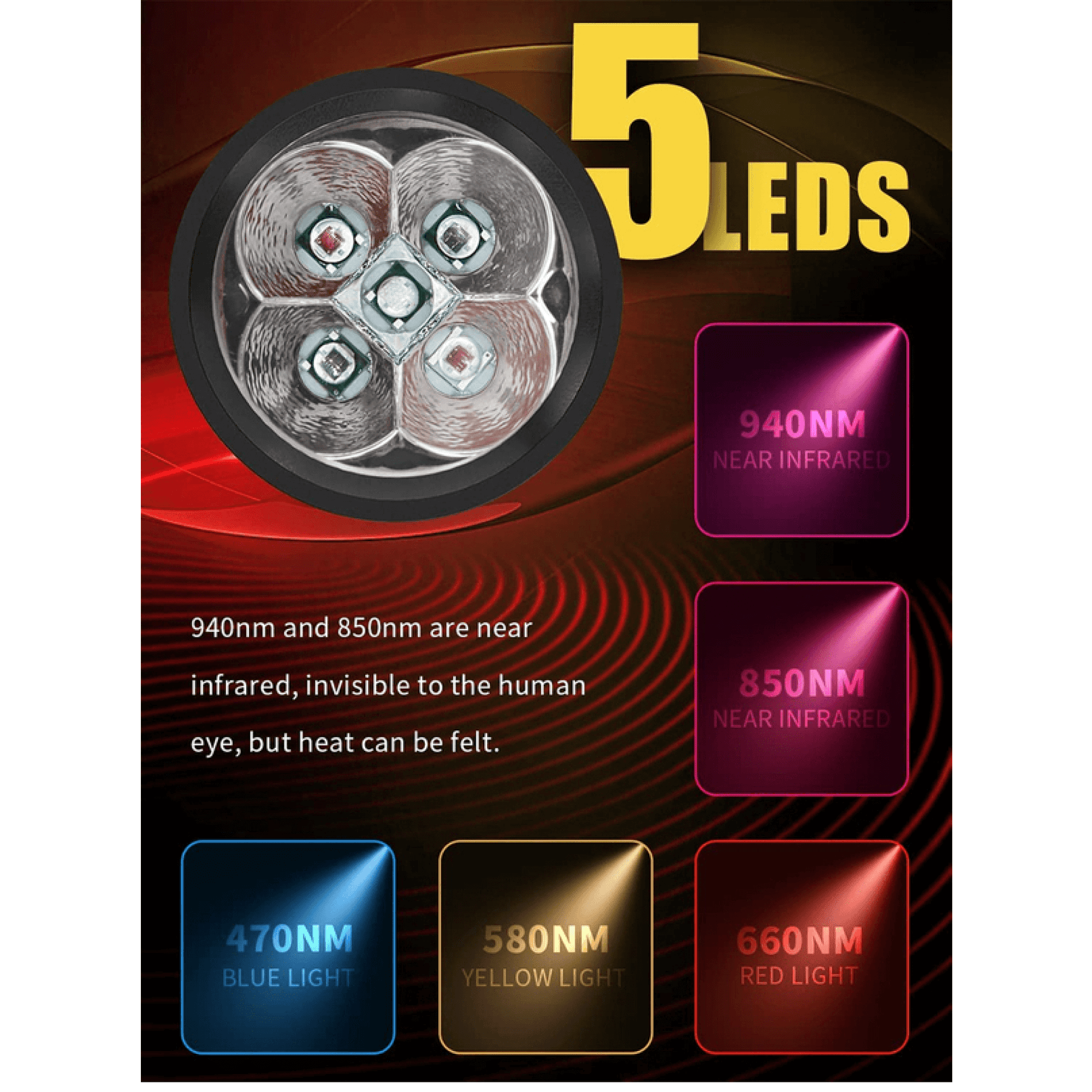 - Flerbølgelengde: Forener blå (470nm), rød (630nm & 660nm), og infrarød (850nm & 940nm) lys for dyptgripende terapi.