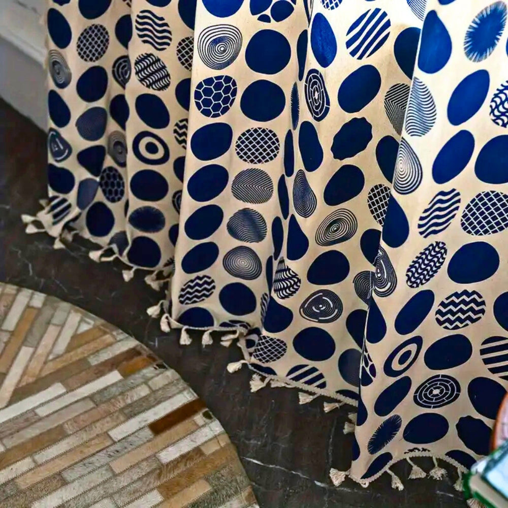 Gi vinduene dine et unikt preg med denne vintage-inspirerte gardinen, prydet med imponerende blå prikker og intrikate mønstre.