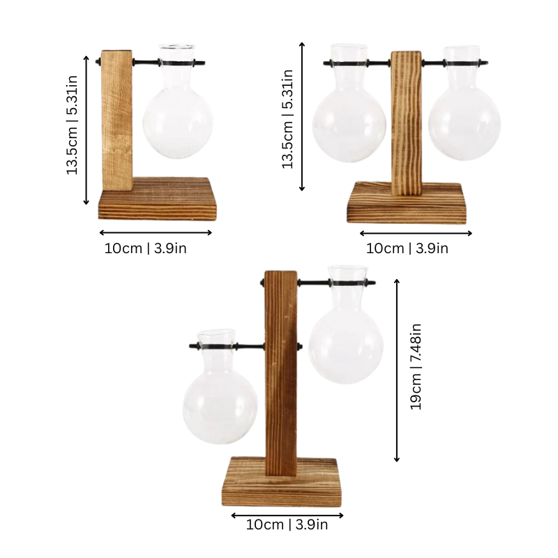 RootLab legger til et preg av vintage sjarm og fredelig grønt for din plass med en håndlaget trestand og glasspære-vaser som forvandler ethvert bord til et beroligende, stilfullt sted for planteformering eller fersk fremvisning.