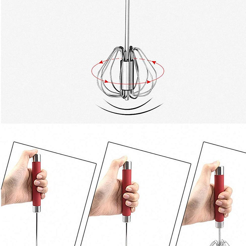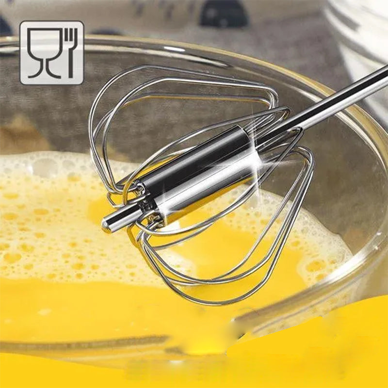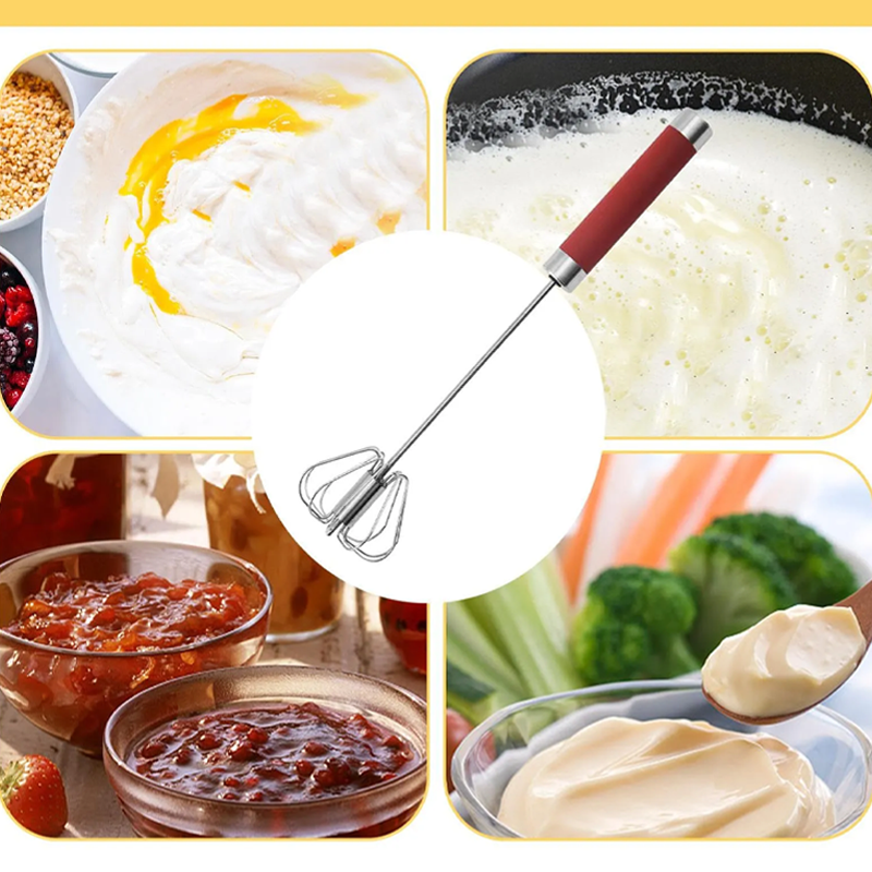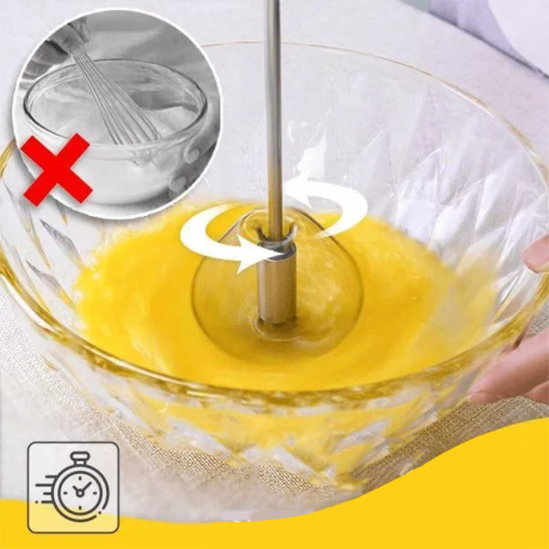 Du kan utføre oppgaver mye mer effektivt med minimal innsats. Ingen behov for batterier eller strøm. Bare trykk på håndtaket for å sette vispebladene i rustfritt stål i bevegelse. Det er perfekt for å blande sauser, marinader, egg, kakerøre, pannekakerøre og mye mer!