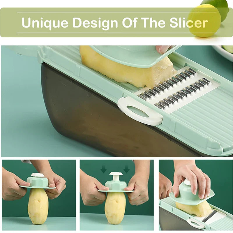 📌 5 utskiftbare kniver: For skjæring, terning, rivning, kubering & vaffelkutt – ideelt for poteter, agurker, gulrøtter, løk og mye mer.