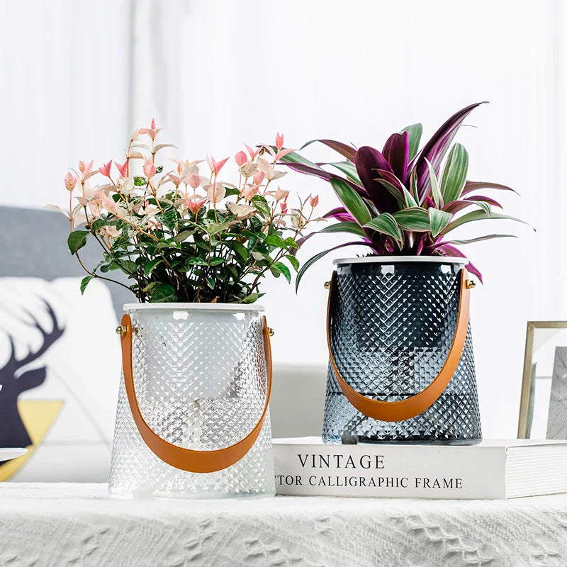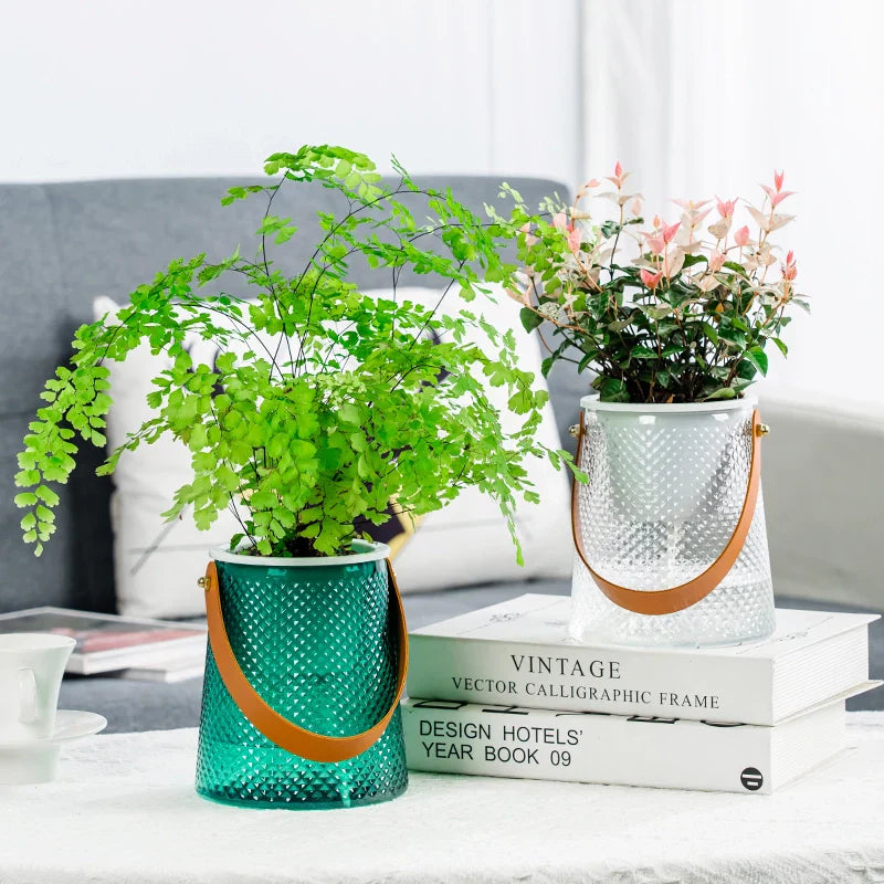 Forvandle ditt innendørsrom med den selvvannende hydroponiske blomsterpotten for sukkulenter, utstyrt med håndtak. Denne moderne, gjennomsiktige potten ikke bare beriker hjemmets estetikk, men gir også en problemfri hageopplevelse. Designet for travle individer og de som lett glemmer å vanne, sørger denne potten for at plantene dine forblir hydrert og friske med minimal innsats. Med en elegant og moderne bøtteveske-design, gir denne blomsterpotten et hint av stil til alle rom. Dens allsidige karakter gjør den perfekt for ulike omgivelser, fra stuer og soverom til kontorer og hager. Det integrerte håndtaket gjør det enkelt å flytte potten, slik at du kan lage varierte og stadig skiftende dekorasjoner.Produktegenskaper
