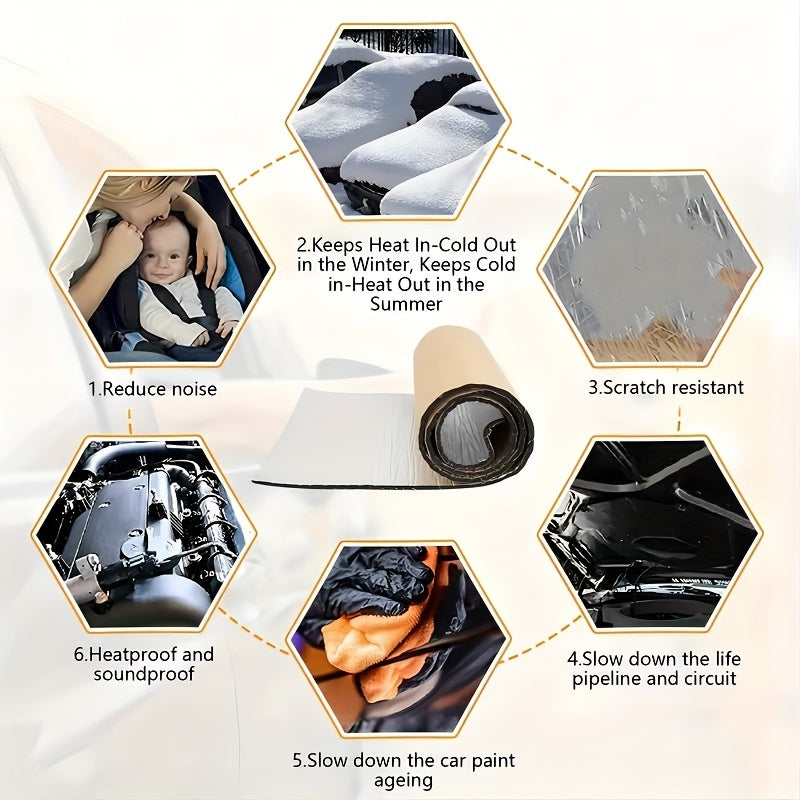 Selvklebende bakside for enkel installasjon: Med en sterk selvklebende bakside kan dette isolasjonsskum enkelt festes uten behov for spesielle verktøy eller lim. Bare kutt til ønsket størrelse, trekk av baksiden, og fest den direkte under motorhetten eller andre steder i kjøretøyet ditt. Limet gir en sikker og langvarig holdbarhet.