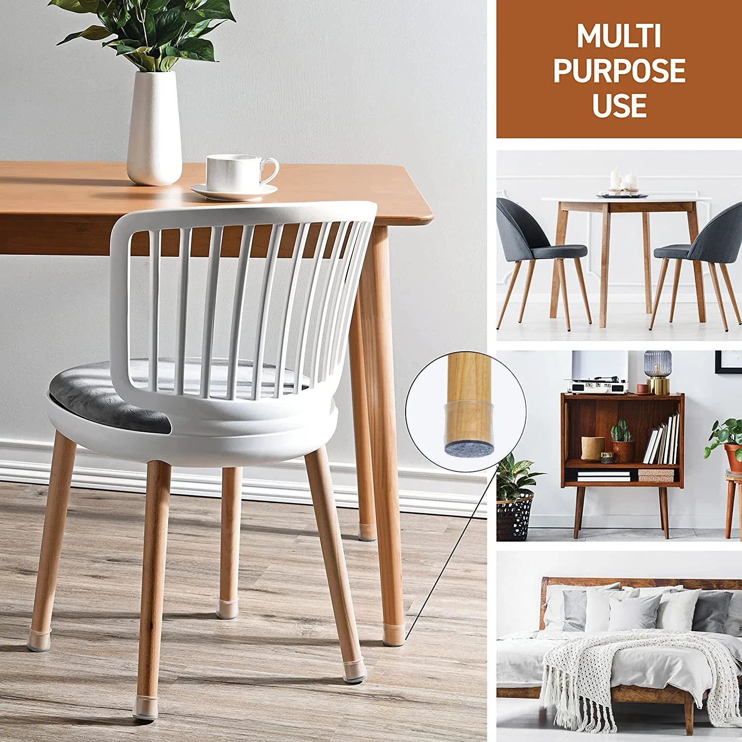 ● De kan brukes på diverse design av runde og firkantede stolben, inkludert kjøkkenstoler, restaurantstoler og utemøbler.