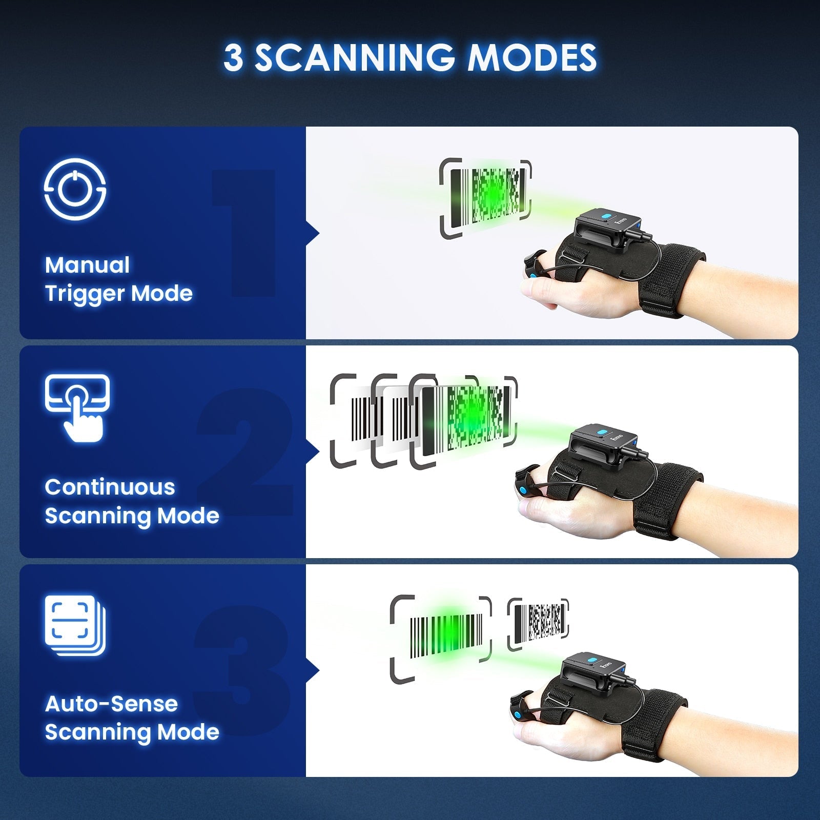Med denne QR-kodeskanneren festet på baksiden av hånden din, kan du konsentrere deg om andre oppgaver i enhver situasjon der hendene dine er frie, i motsetning til tradisjonelle håndholdte skannere. De irriterende bevegelsene med å plukke opp og legge ned redskaper reduseres, noe som gjør arbeidsprosessen jevn og sparer tid, samt øker effektiviteten betraktelig.
