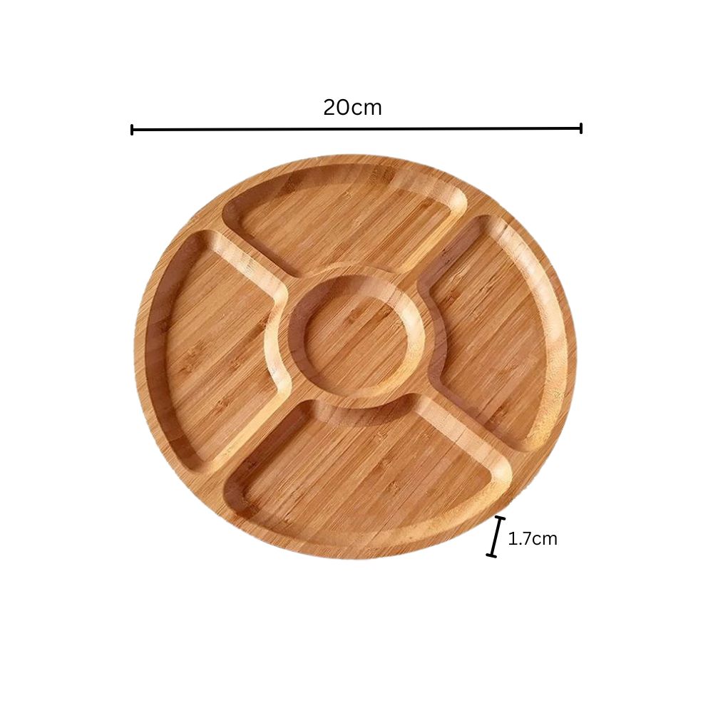 Dette snurrende serveringsbrettet for snacks gjør småspising til en koselig og godt organisert opplevelse. Med sitt sirkulære design med fem rom, er det ideelt for å tilby nøtter, frukt, søtsaker eller tapas. Produsert av naturlig tre, kombinerer dette stilige brettet funksjonalitet med estetisk appell.
