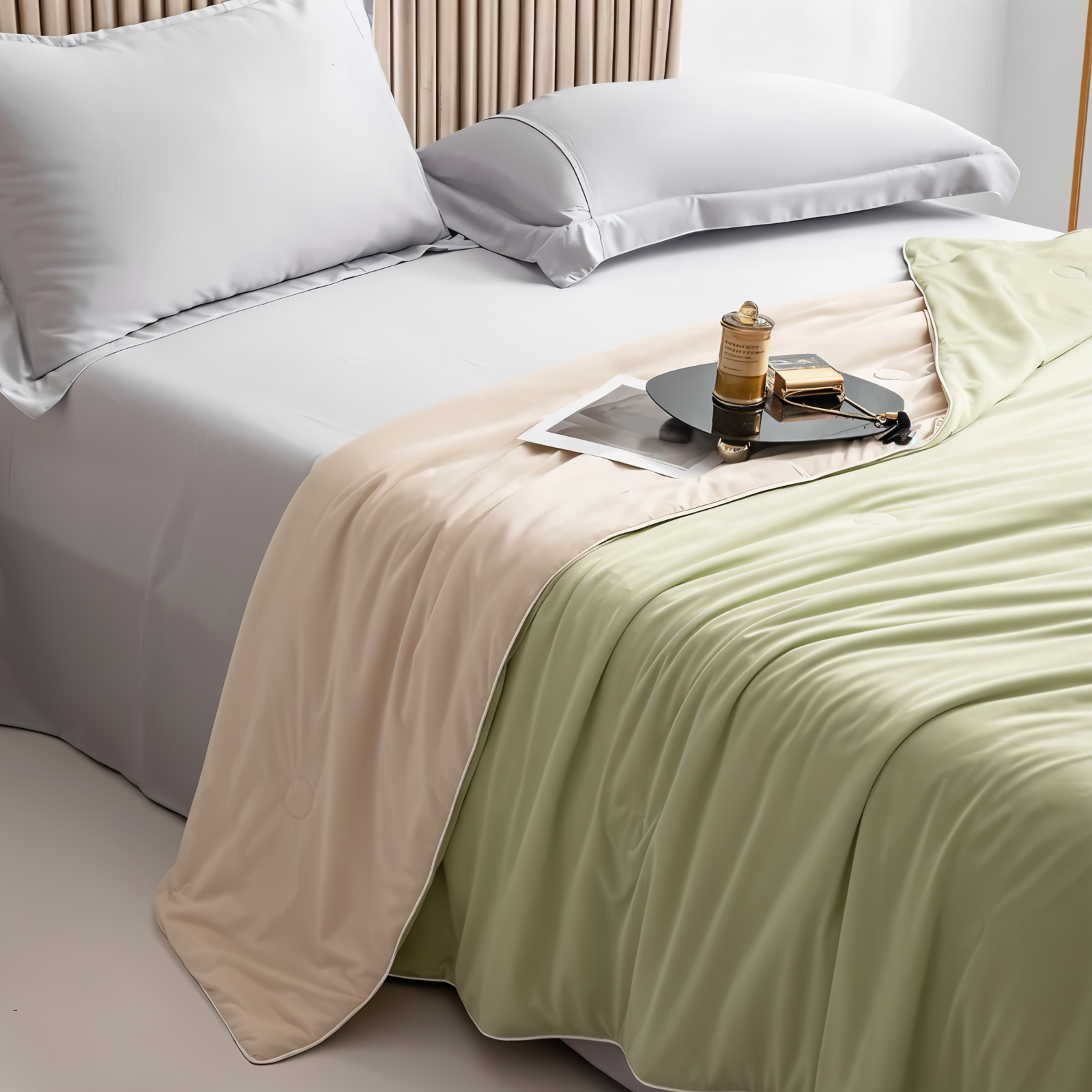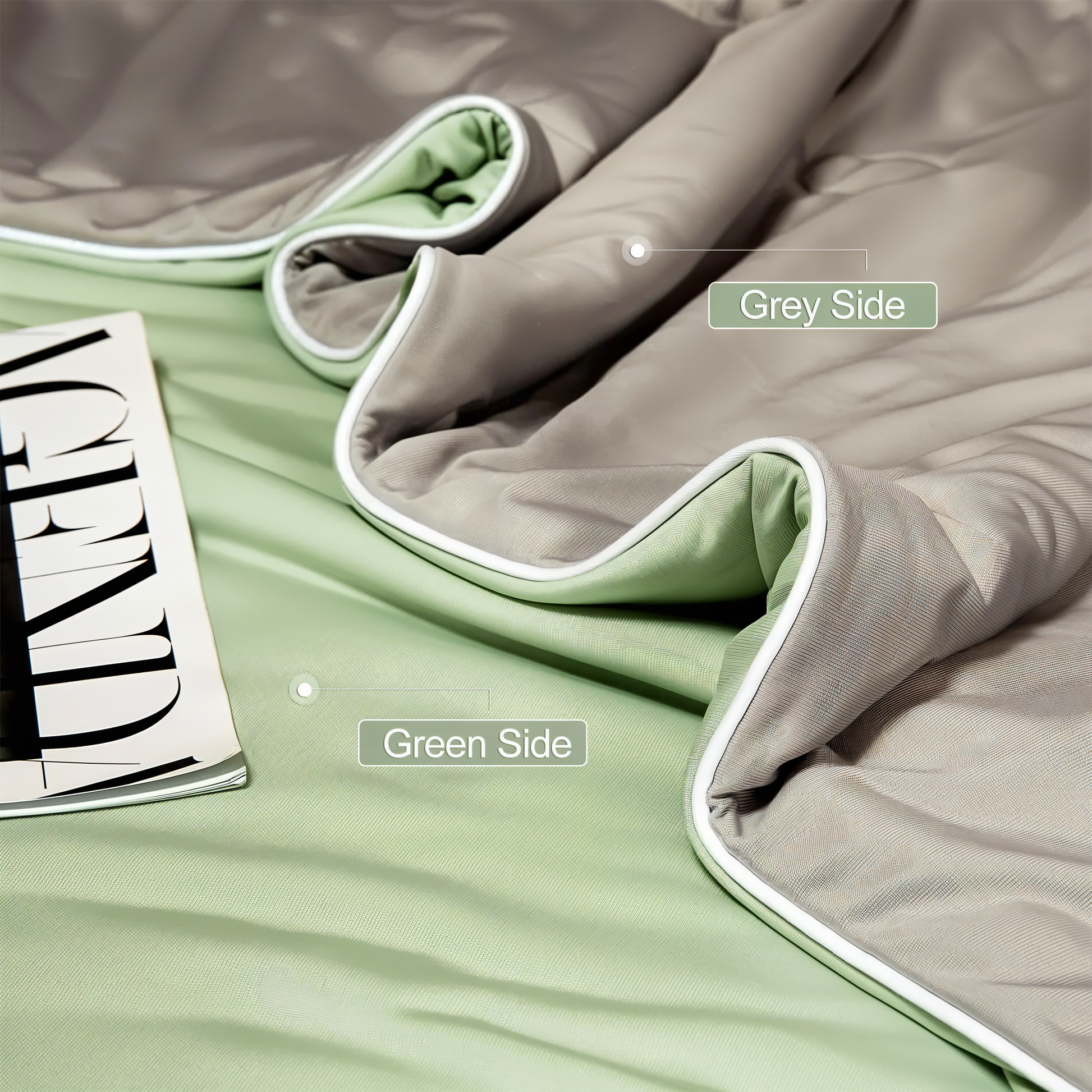 • Dobbeltsidig design: Kjølefiber for sommerbruk, myk bomull for hele året.