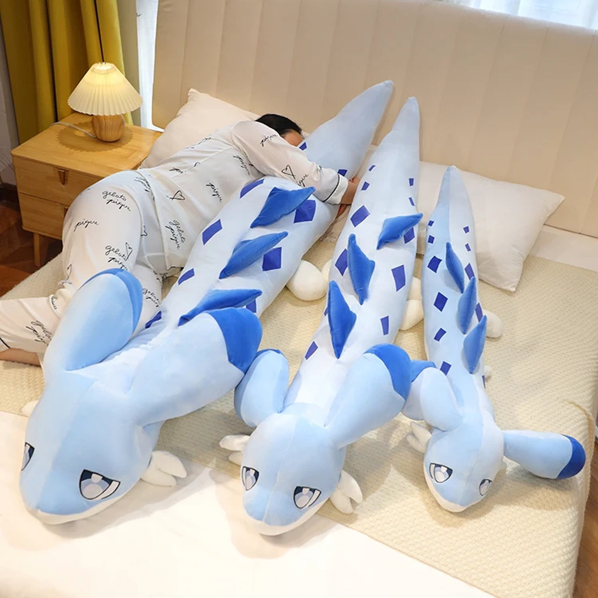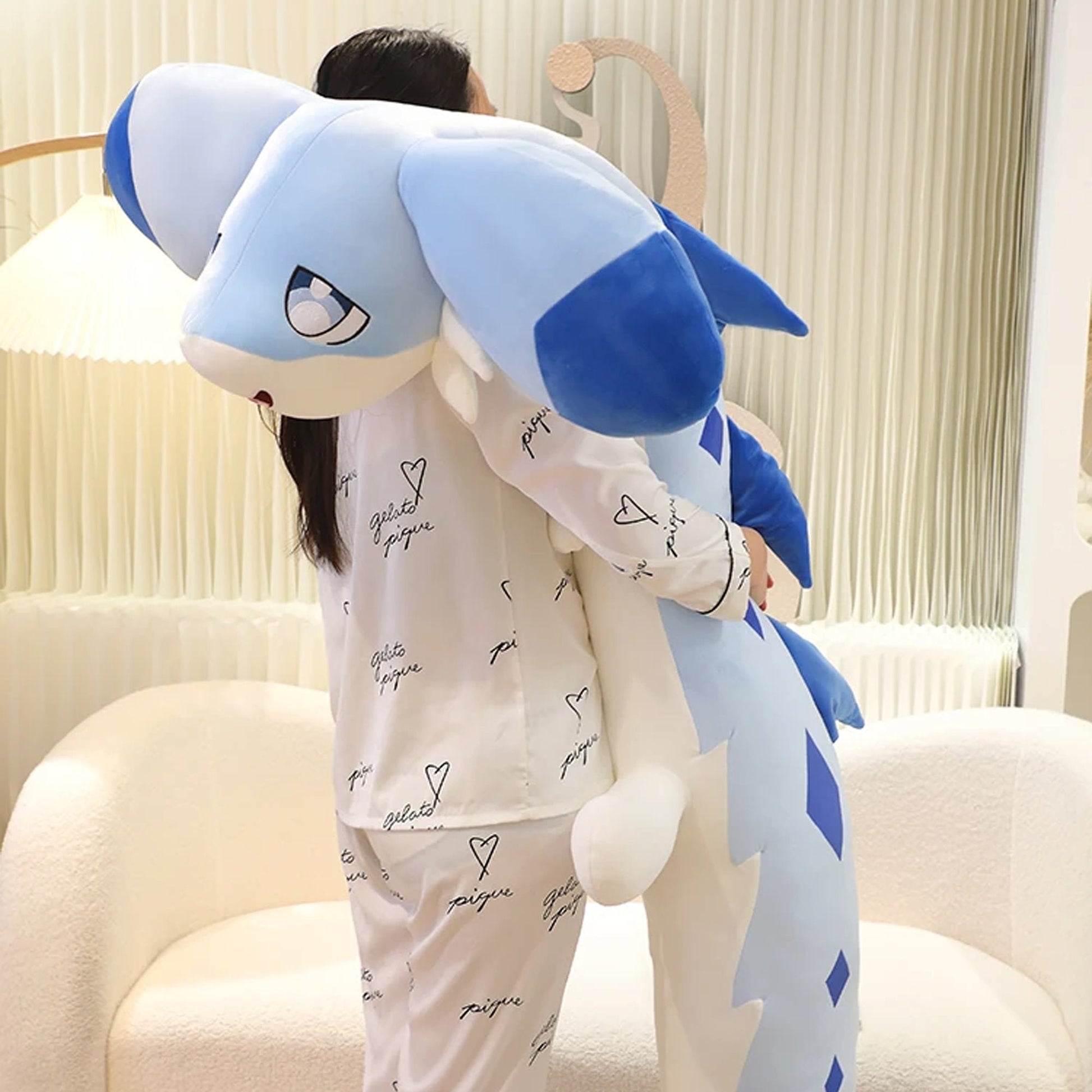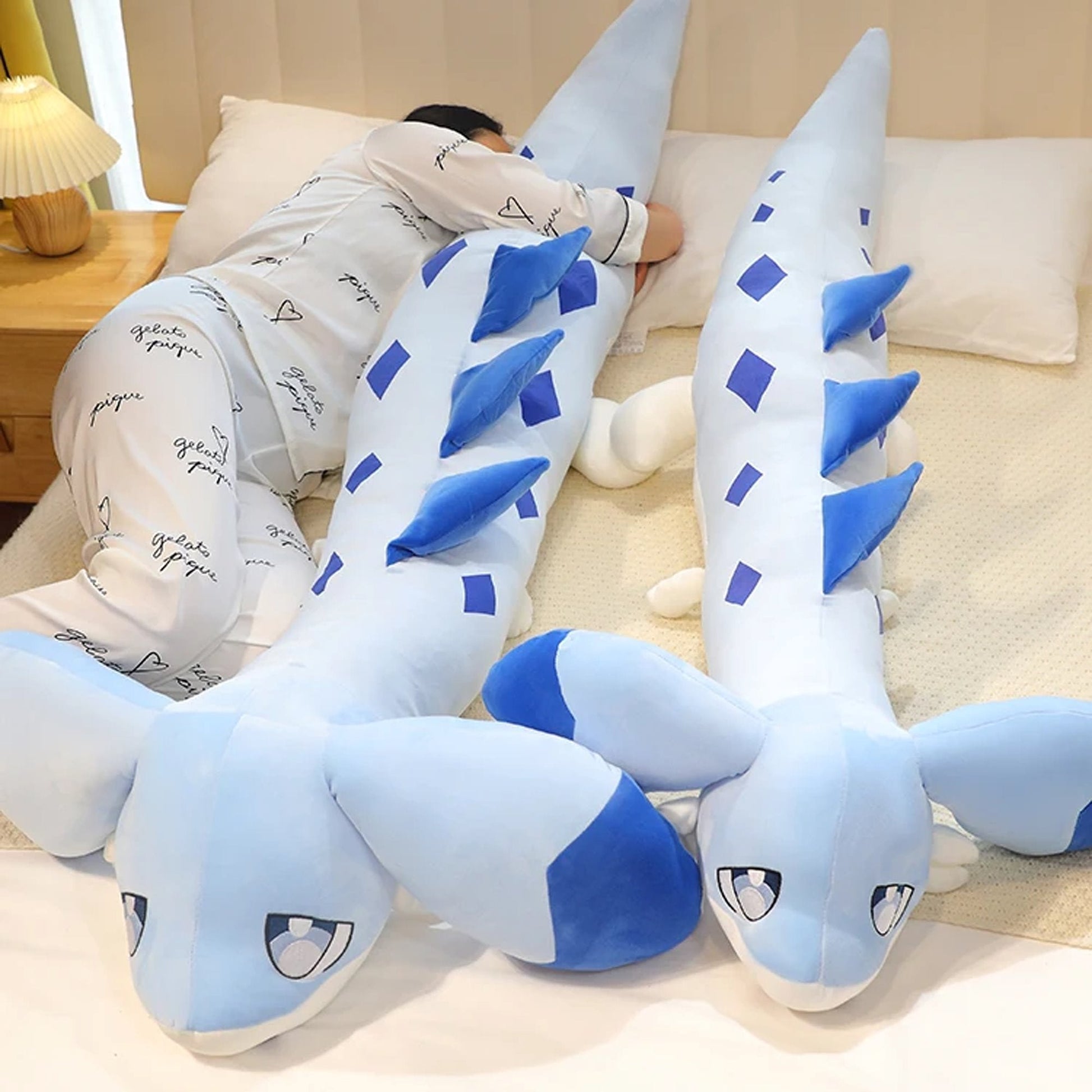 Denne sjarmerende blå dragen er laget av uimotståelig mykt materiale og svampete fyll for de ultimate klemene. Fyllt med 100 % high-quality PP bomull og venter på å bli klemmet hele natten. Den har en langkroppede, vingeløse drage med gigantiske ører og store øyne. Kroppen er babyblå med mørkeblå merker og en hvit underside. Langs ryggen er det flere draconic ryggrader.