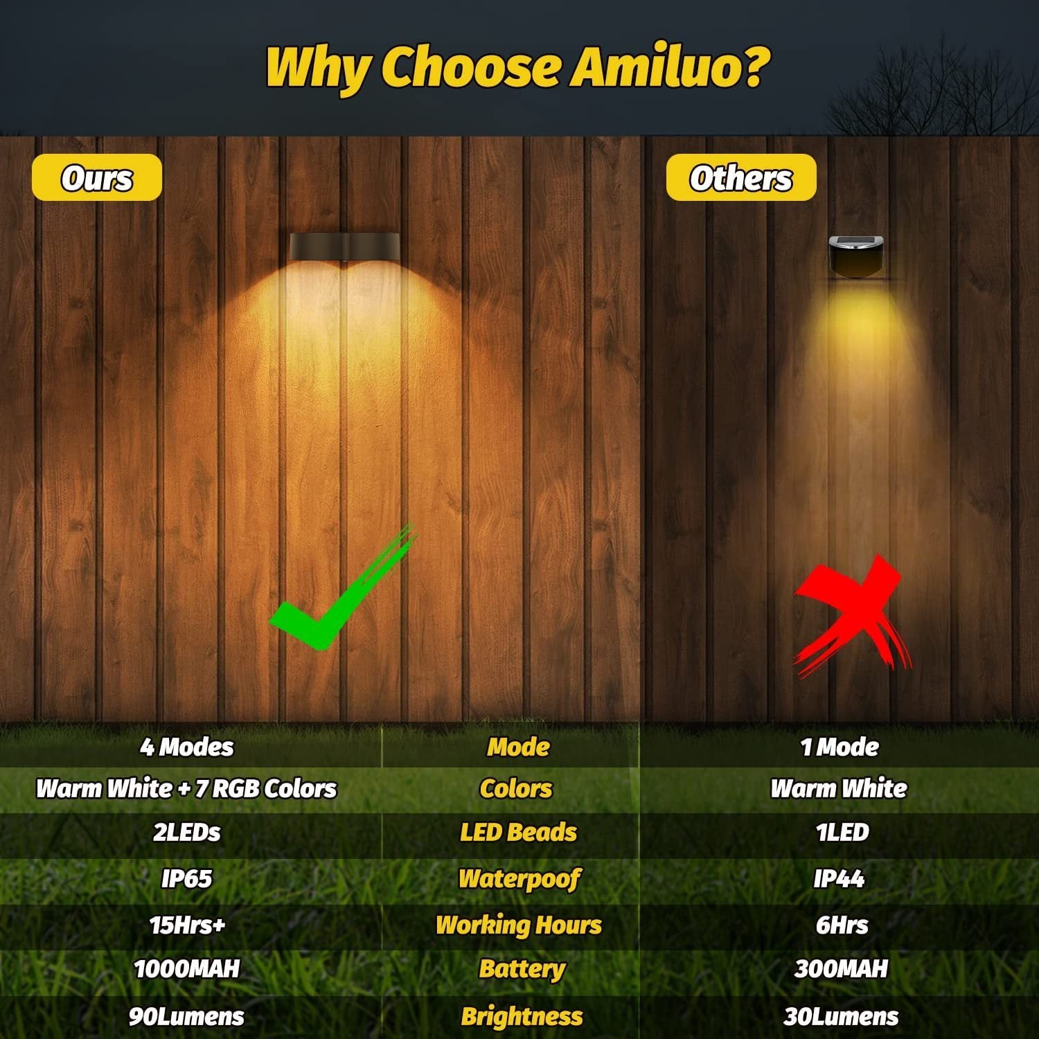 - 【Enkel Installasjon av Sollys for Gjerder】Amiluo solcelledrevne lys som lyser opp fra kveld til daggry er lett å montere; bare skru dem fast, så er de klare til bruk. Hvis du foretrekker en midlertidig løsning, kan du også bruke dobbeltsidig tape, da lysene er lette og tapen holder dem godt på plass.