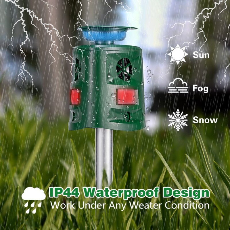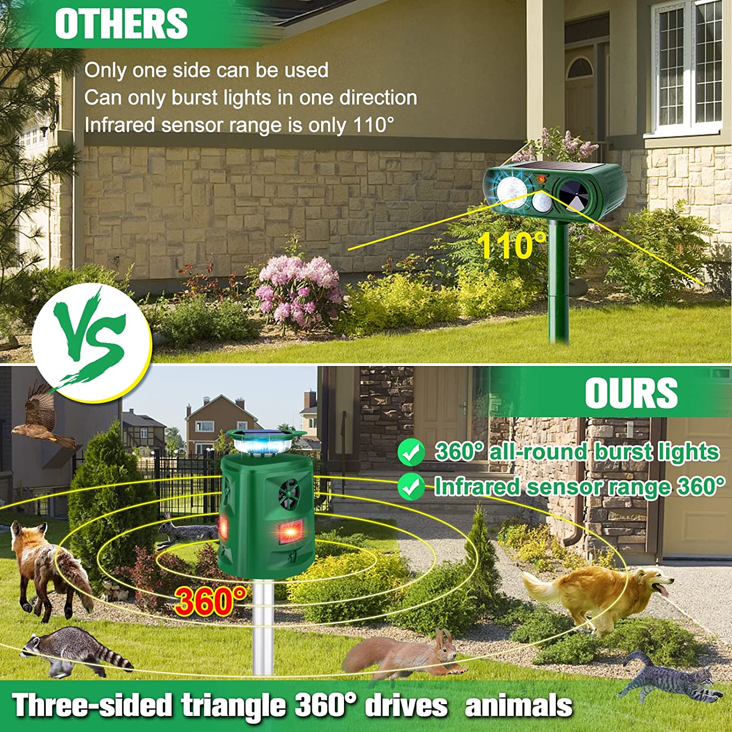Sustainable and Effective Solar Powered Animal Repeller: Having trouble with animals destroying your home or garden? This outdoor animal purification system is safe for both pets and the environment. Using ultrasonic waves that are audible only to animals, it provides an eco-friendly solution powered by sunlight. The built-in motion sensor ensures the safety of both your loved ones and nature.