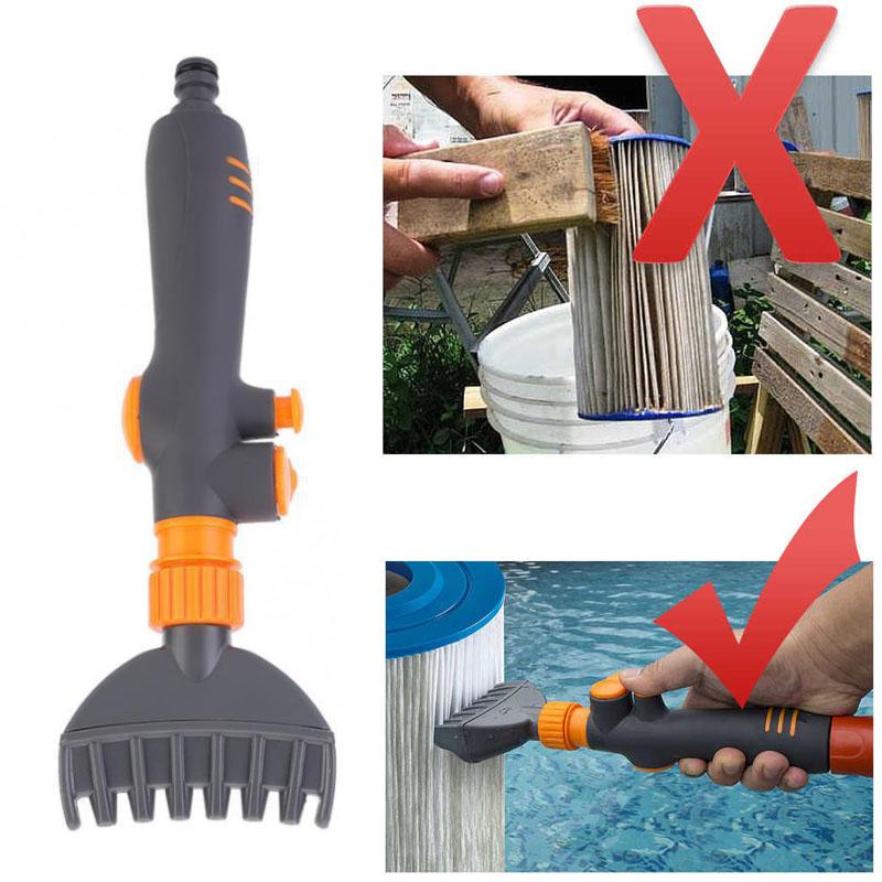 FØRSTEKLASSE DESIGN: Den unike konstruerte enheten med 6 dyser sikrer optimal vannfordeling og gjør det enkelt å fjerne smuss fra enhver filterfold samtidig som den bevarer ressurser. En praktisk start/stopp-knapp gir brukervennlighet; trykk på start for å begynne, og stopp for å avslutte rengjøringen. Den roterende knappen tillater justerbar kontroll av vannstrømmen. Det er også en smart oppbevaringsløsning for slangeanslutningen som utvider rekkevidden til rengjøreren for svømmebassengets filterdyse.