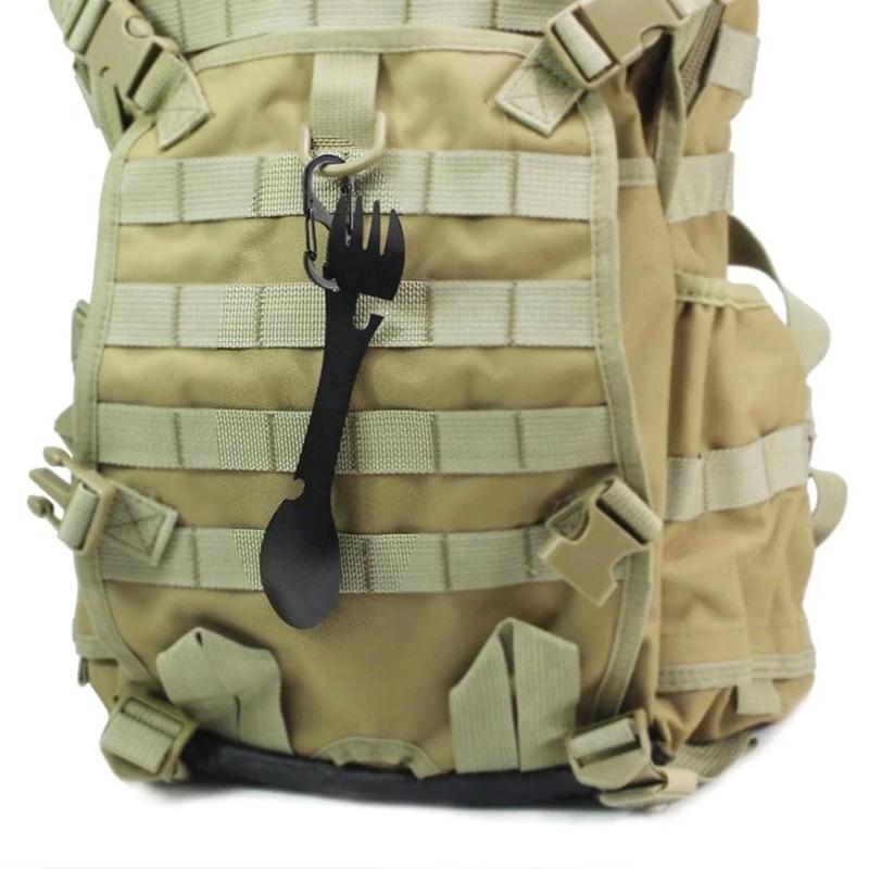 Gaffel, kniv, skje, boksåpner og flaskeåpner samlet i ett praktisk verktøy, som forenkler utendørs måltider.