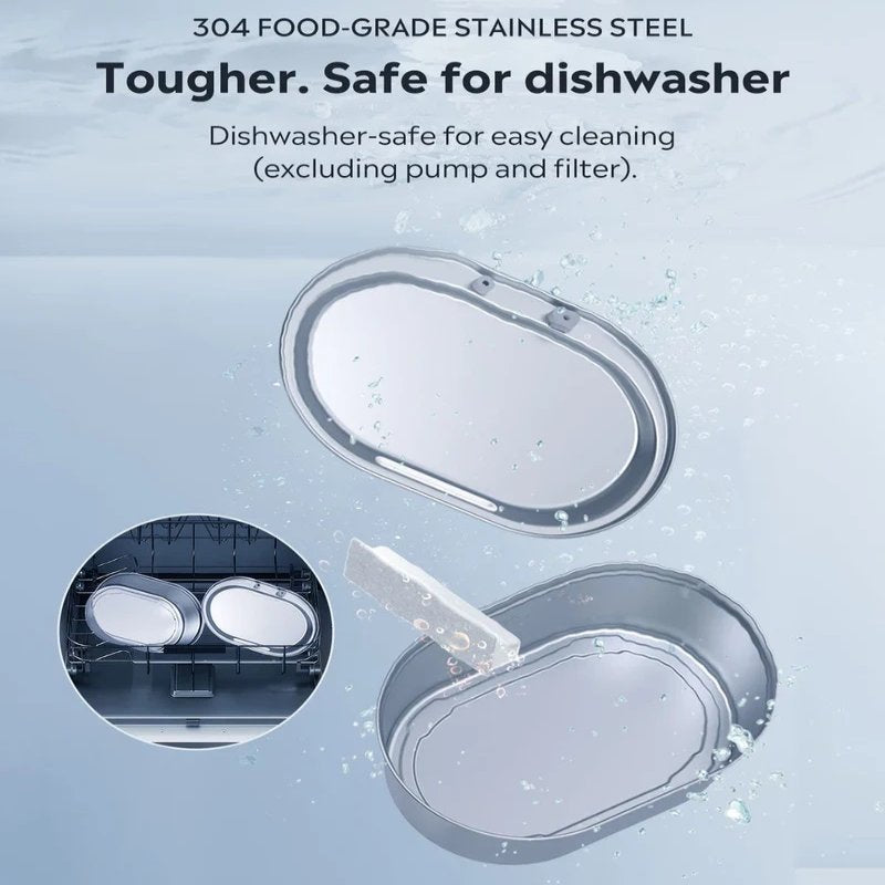 Vår kattevannfontene, laget av 304 matgodkjent rustfritt stål, tilbyr ekstraordinær holdbarhet og hygiene. Dens solide oppbygging sikrer at vannet forblir trygt og friskt for kjæledyret ditt, og den oppvaskmaskinvennlige funksjonen (unntatt pumpen og filteret) gjør rengjøring til en lek. Denne beste kattens vannfontene gir deg mulighet til enkelt å opprettholde en ren vannkilde for katten din.