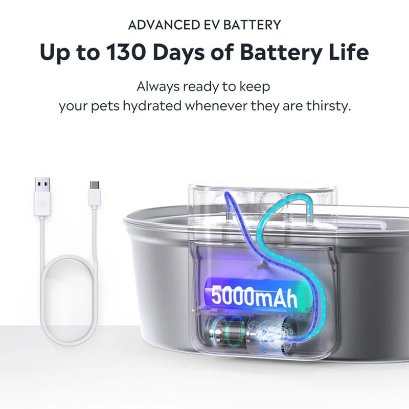 Med et avansert EV-batteri som kan vare i opp til 130 dager, holder denne rustfrie stål kattens vannfontene kjæledyret ditt hydrert uten behov for hyppige oppladingstider. Enten du er hjemme eller er borte, kan du være trygg på at kjæledyret ditt alltid har tilgang til rent vann.