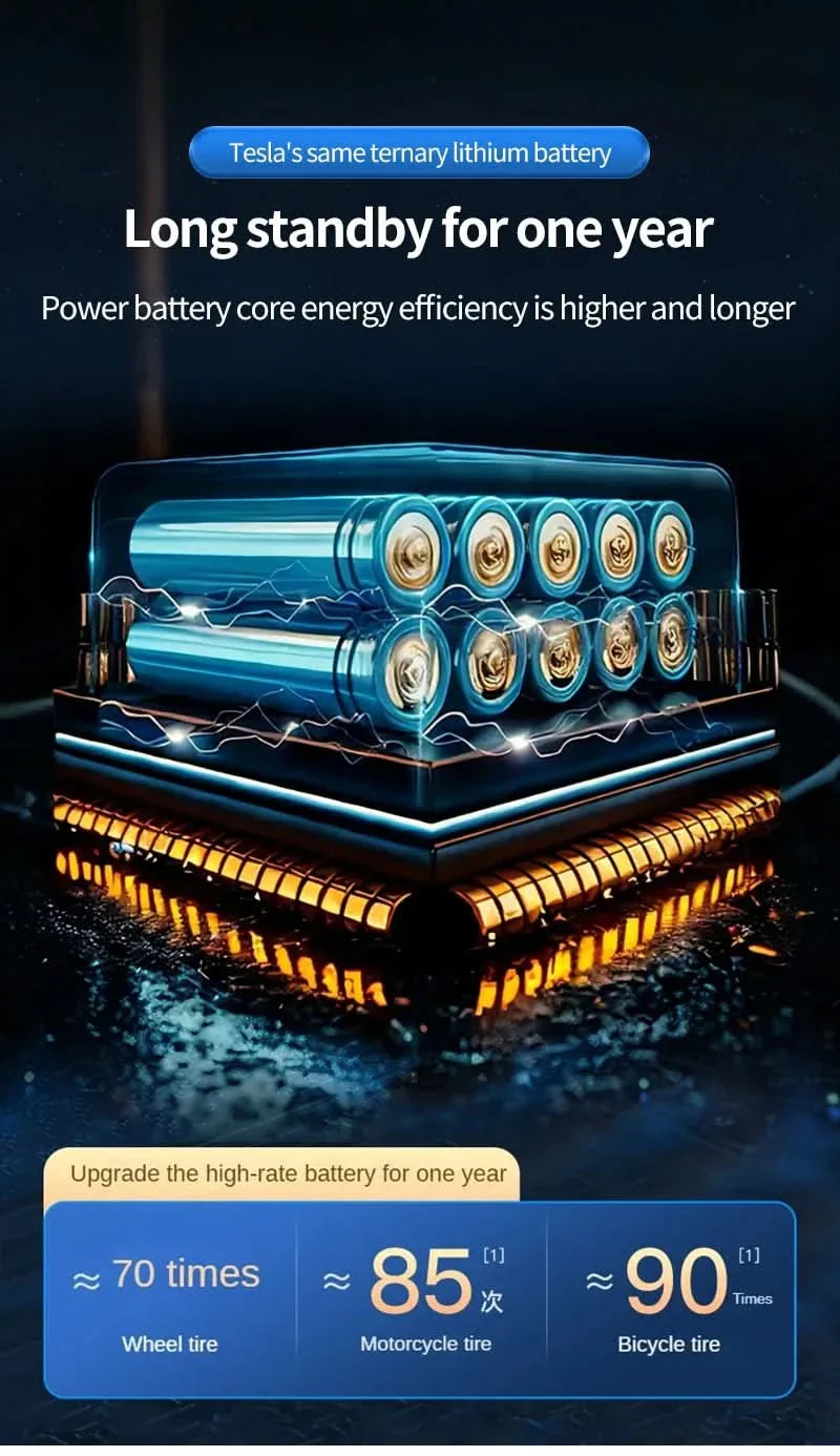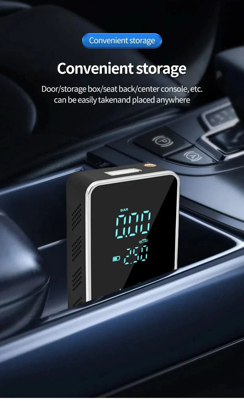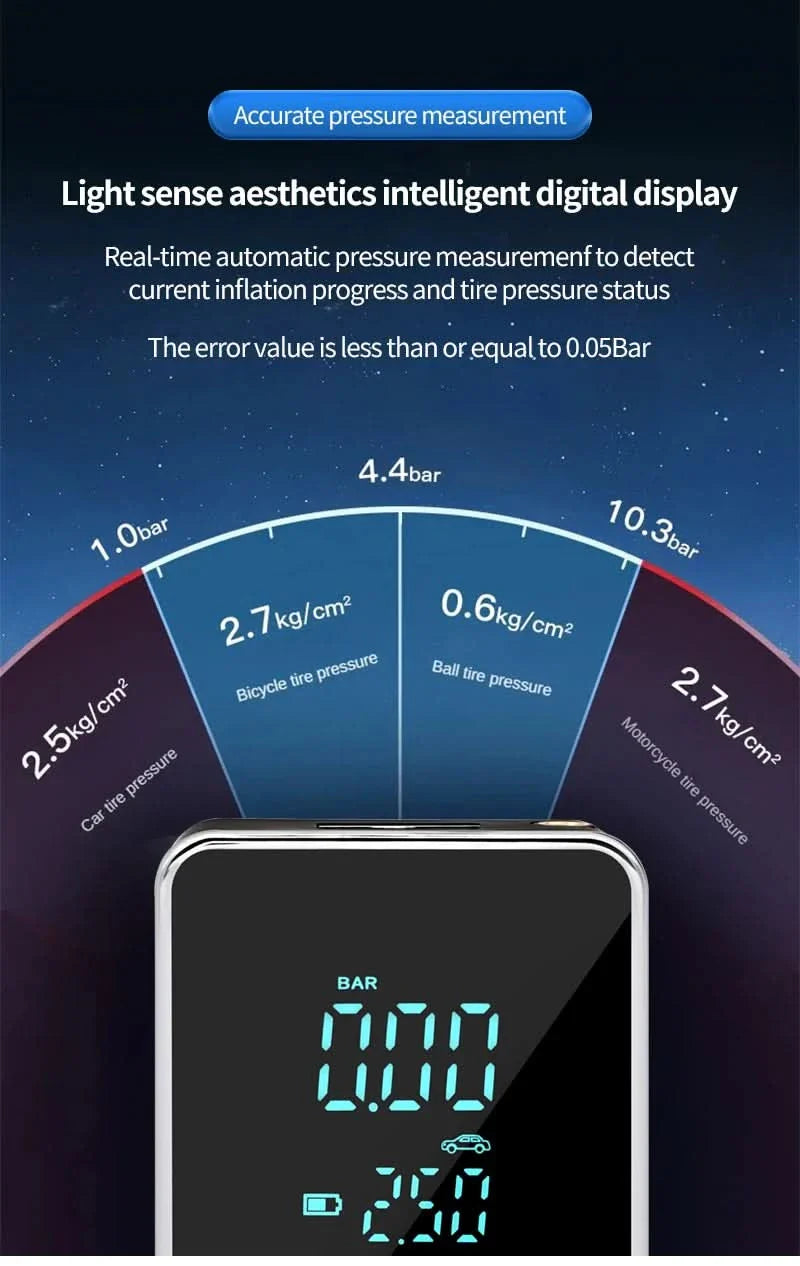 Den bærbare trådløse luftpumpen med 150psi er den perfekte dekkpumper for biler, sykler og motorsykler. Den brukervennlige berøringsskjermen sikrer enkel betjening og presise trykkinnstillinger.