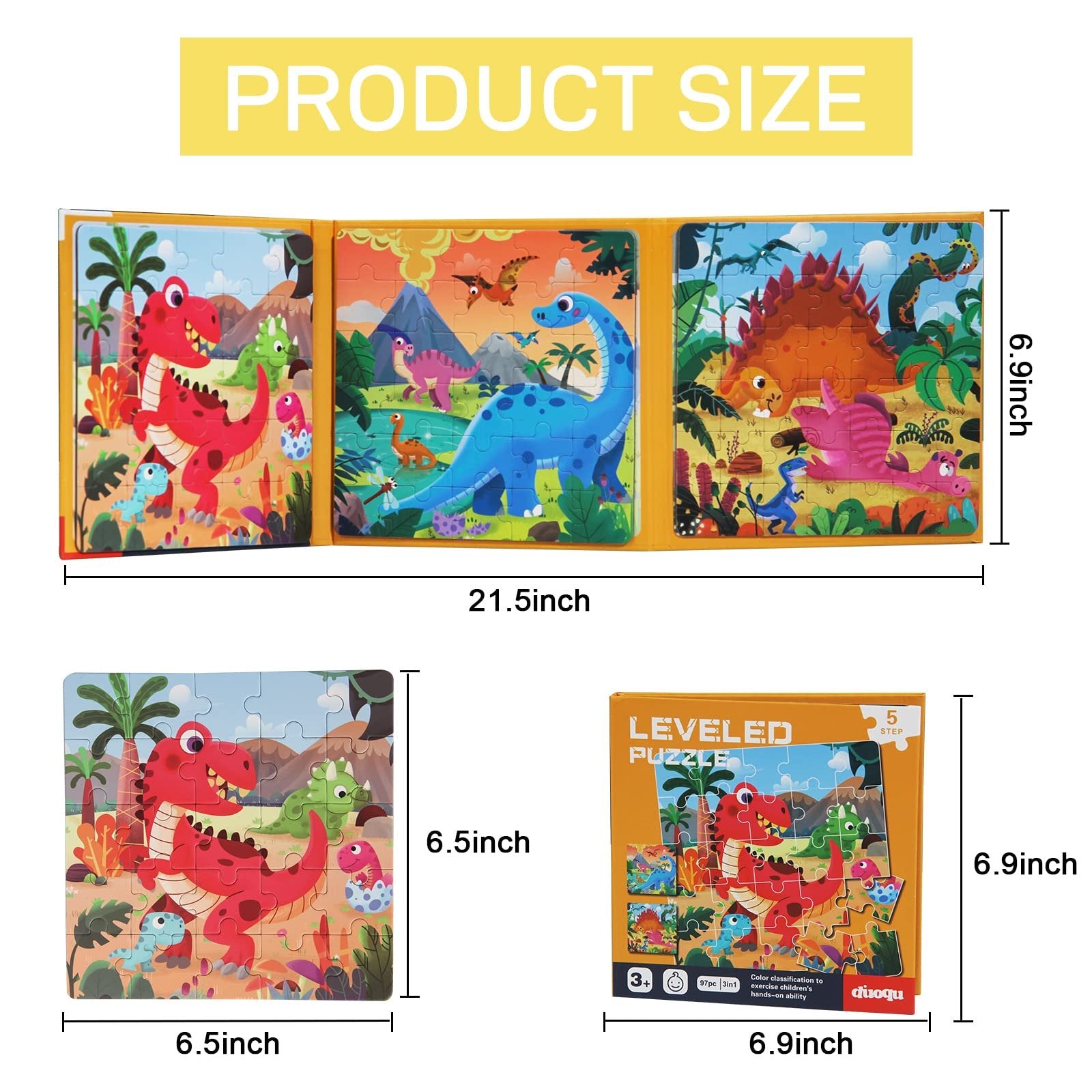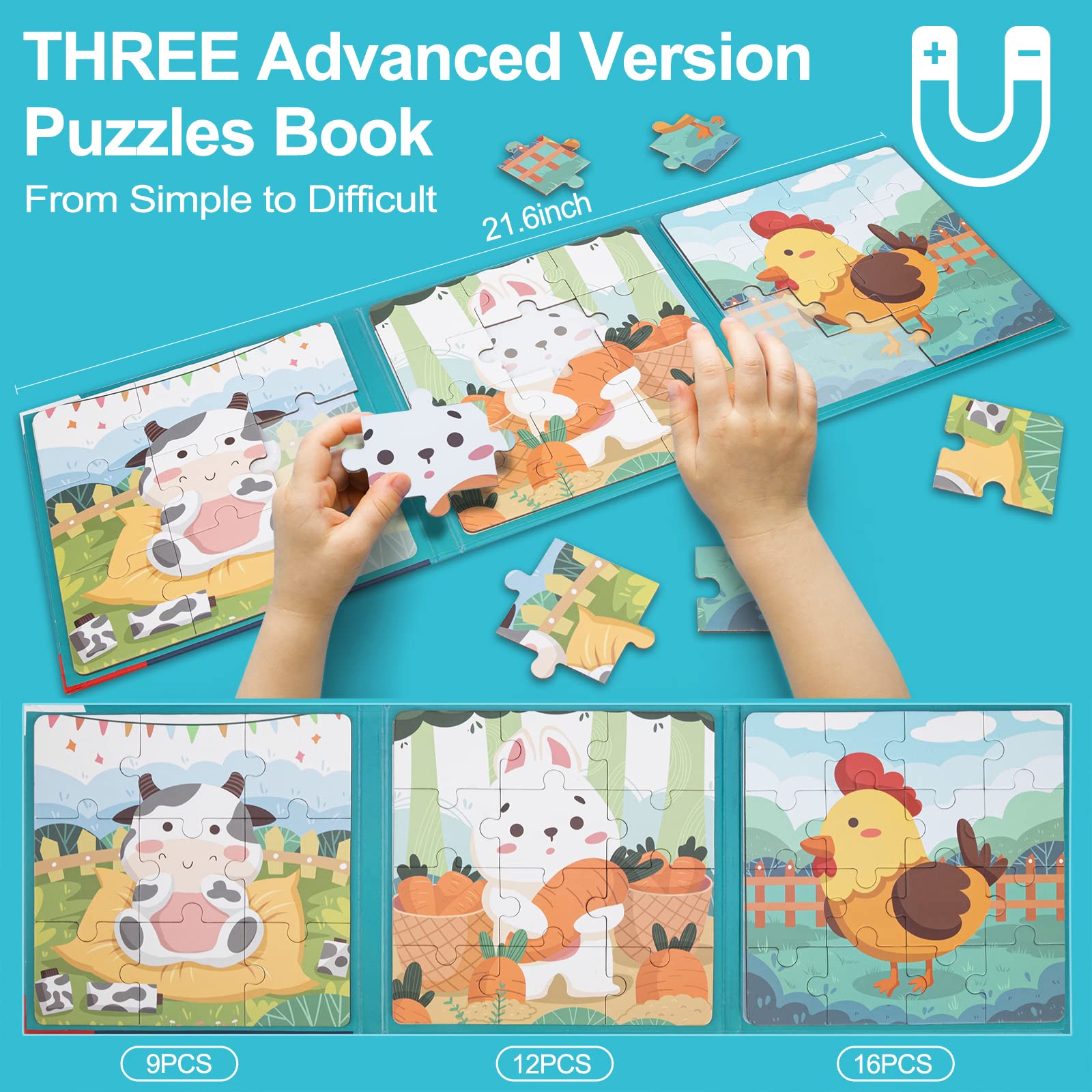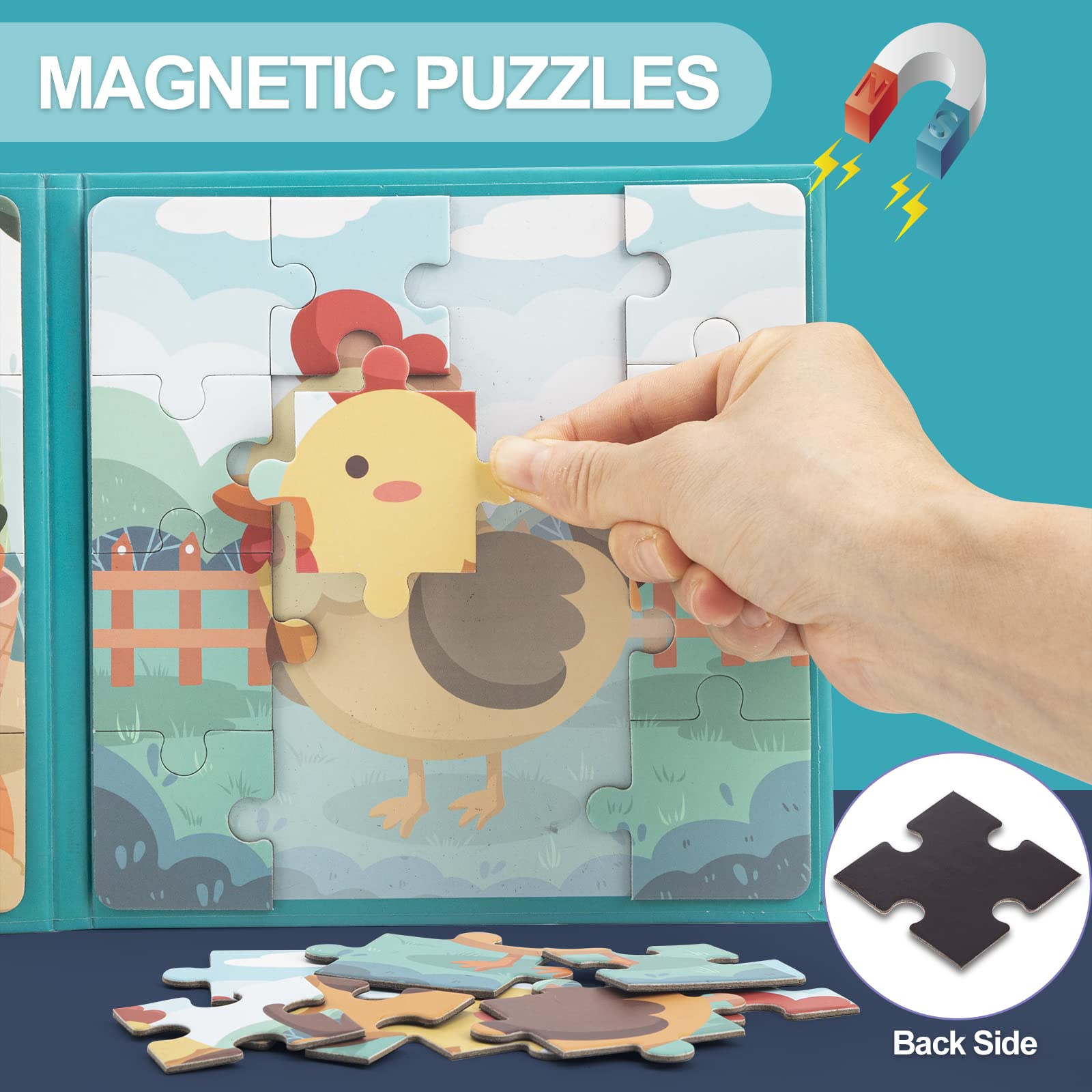Det magnetiske designet eliminerer bekymringer om å miste puslespillet, og de tre puslespillbitene kombineres til en bok for enkel transport.