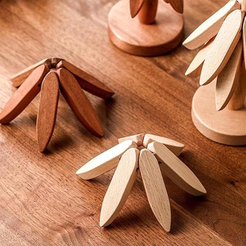Dette settet inkluderer tre varmebestandige, tre-inspirerte trebrikker med en solid stativ, som tilbyr stilfull beskyttelse av overflaten, miljøvennlige materialer og enkel vedlikehold for enhver bordsetting.