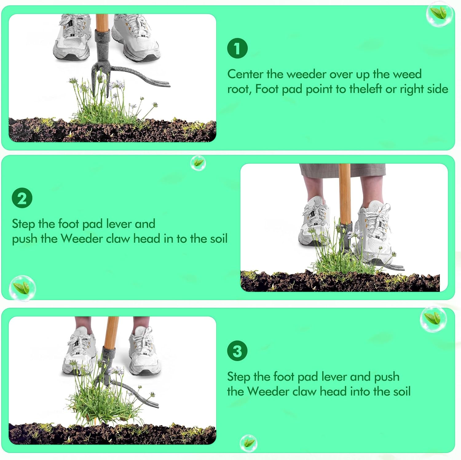 Med denne ugressfjerneren kan du si adjø til konstant bøying og kjedelig luking. De 4 sterke klørne retter seg mot ugresset ved roten, og gir effektiv kontroll. Du kan holde hagen din i topp tilstand raskere og lettere, samtidig som du unngår belastning på ryggen og unødvendig innsats.