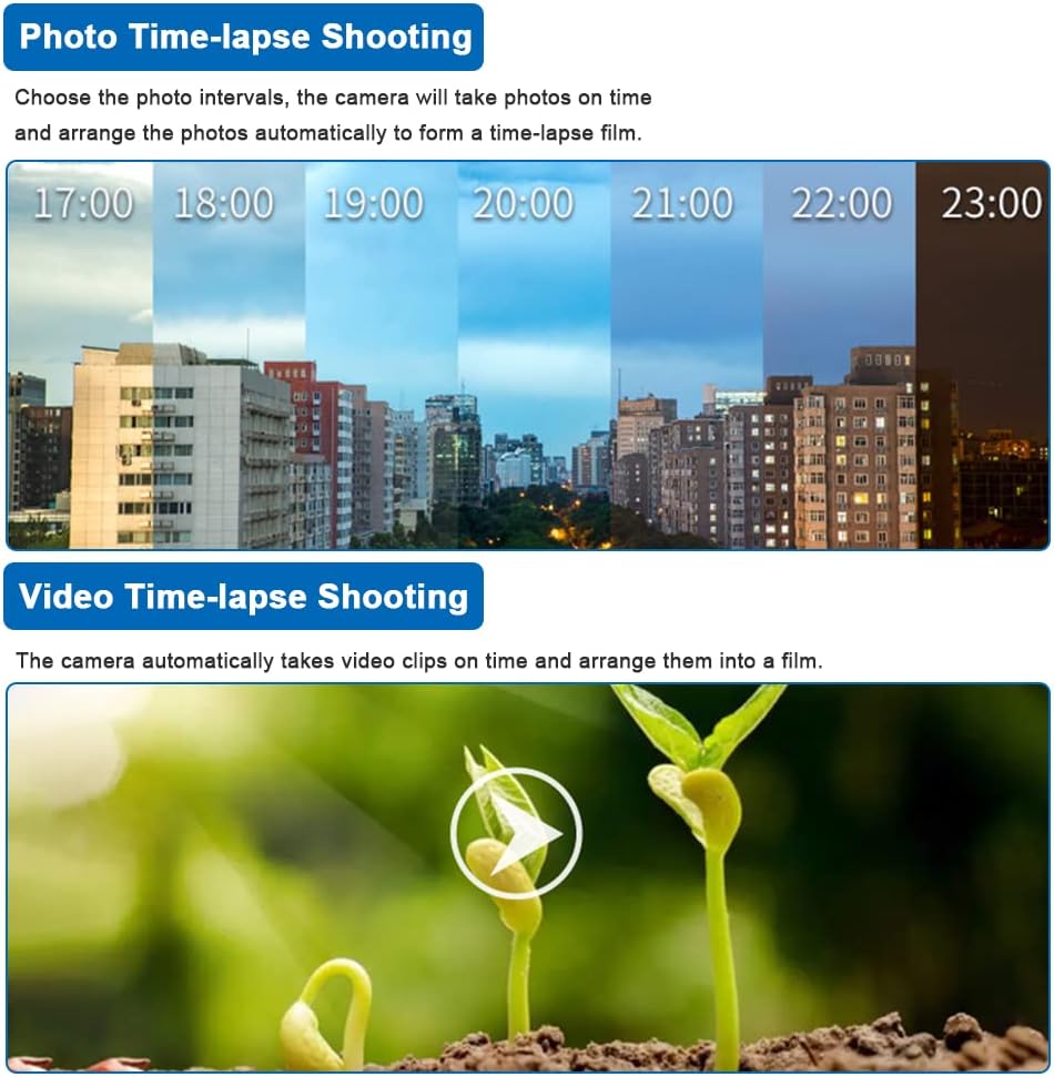 Dette utendørs tidsforsinkelseskameraet tar opp klare 32 MP bilder og jevne 4K videoer med lyd. Den roterende skjermen på 90° gjør oppsett og overvåking enkelt, mens justerbar fokus lar deg fange motiver på nært hold eller på avstand. Et innebygd LED-lys gir klare bilder i dårlig lys, og løpende opptak sikrer at du aldri går glipp av viktig opptak. Med opptil seks måneder batterilevetid per ladning og støtte for TF-kort opptil 512 GB, er det designet for langvarige prosjekter, byggeovervåking eller utendørs eventyr.